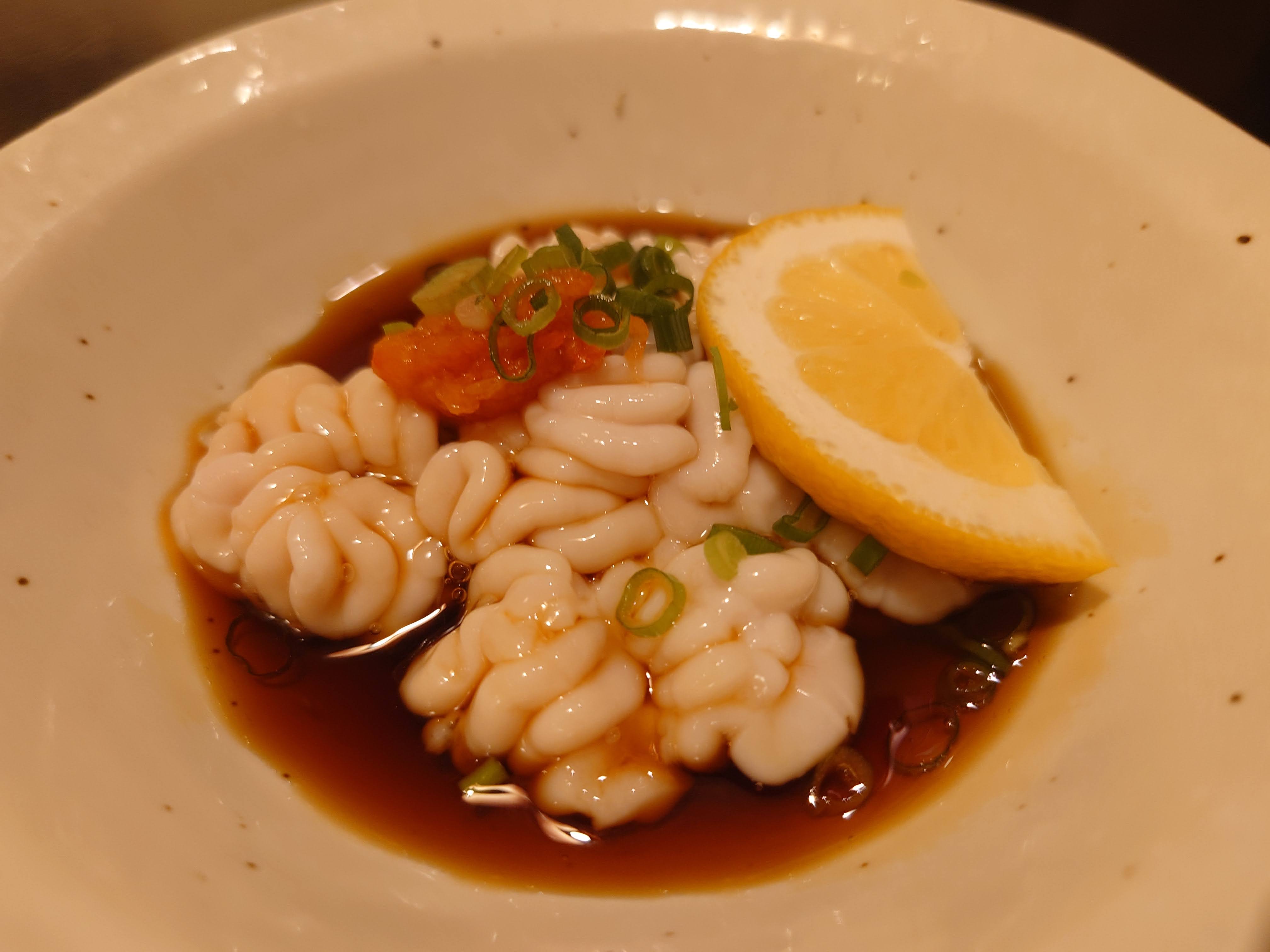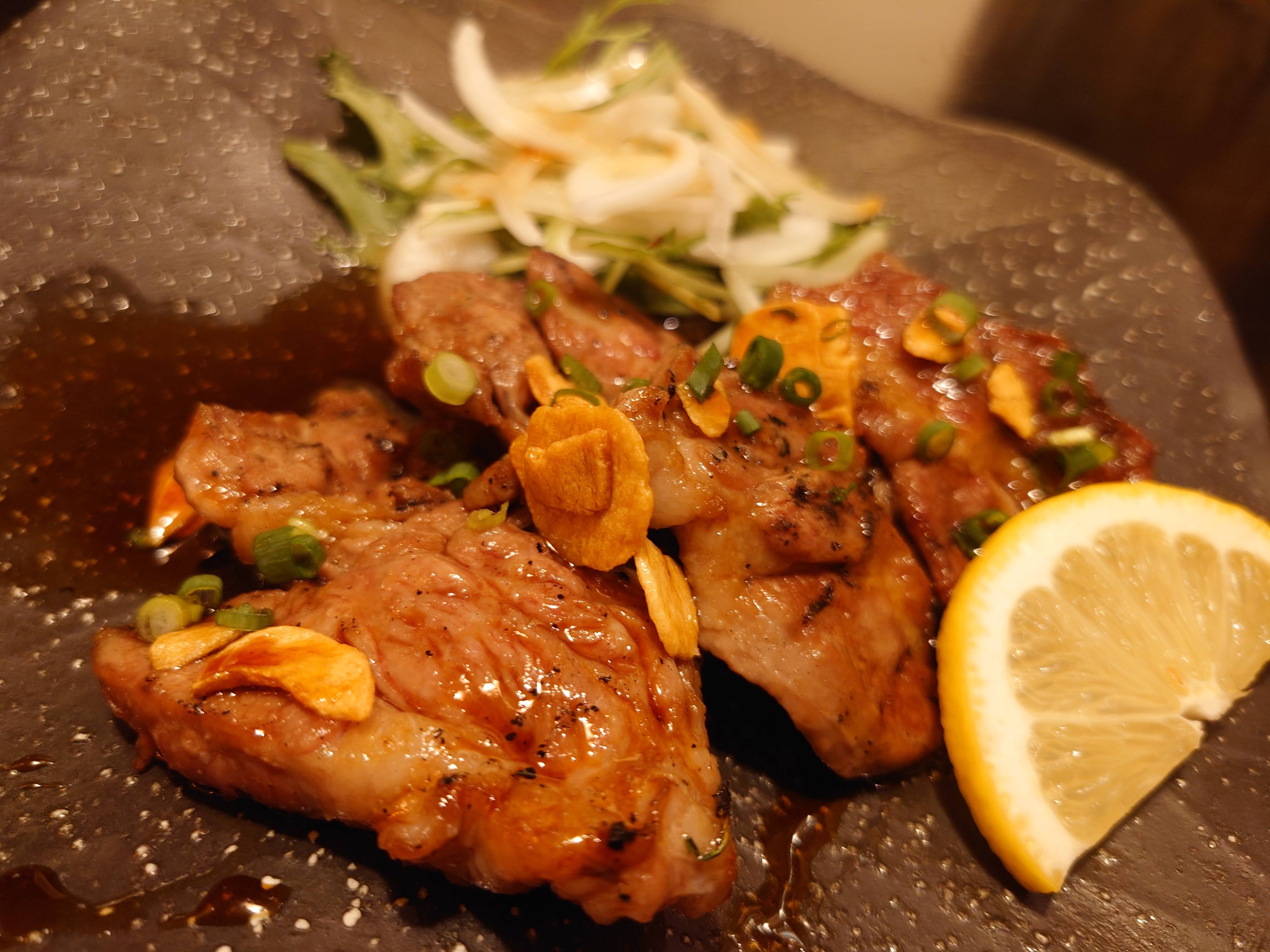 何といっても1時間しかないので、まずは調理に時間のかからないであろうメニューをチョイス!真タチのポン酢♪ プリプリしていて、ポン酢はちょい濃いめだけど、爽やかな風味で実に旨い♪ レモンを絞ると、いつもと違った味わいになり、良い感じで冬の味覚を実感できる一品です。そして、もちろん肉も食べたくなる!ってことで選んだのはこれです。