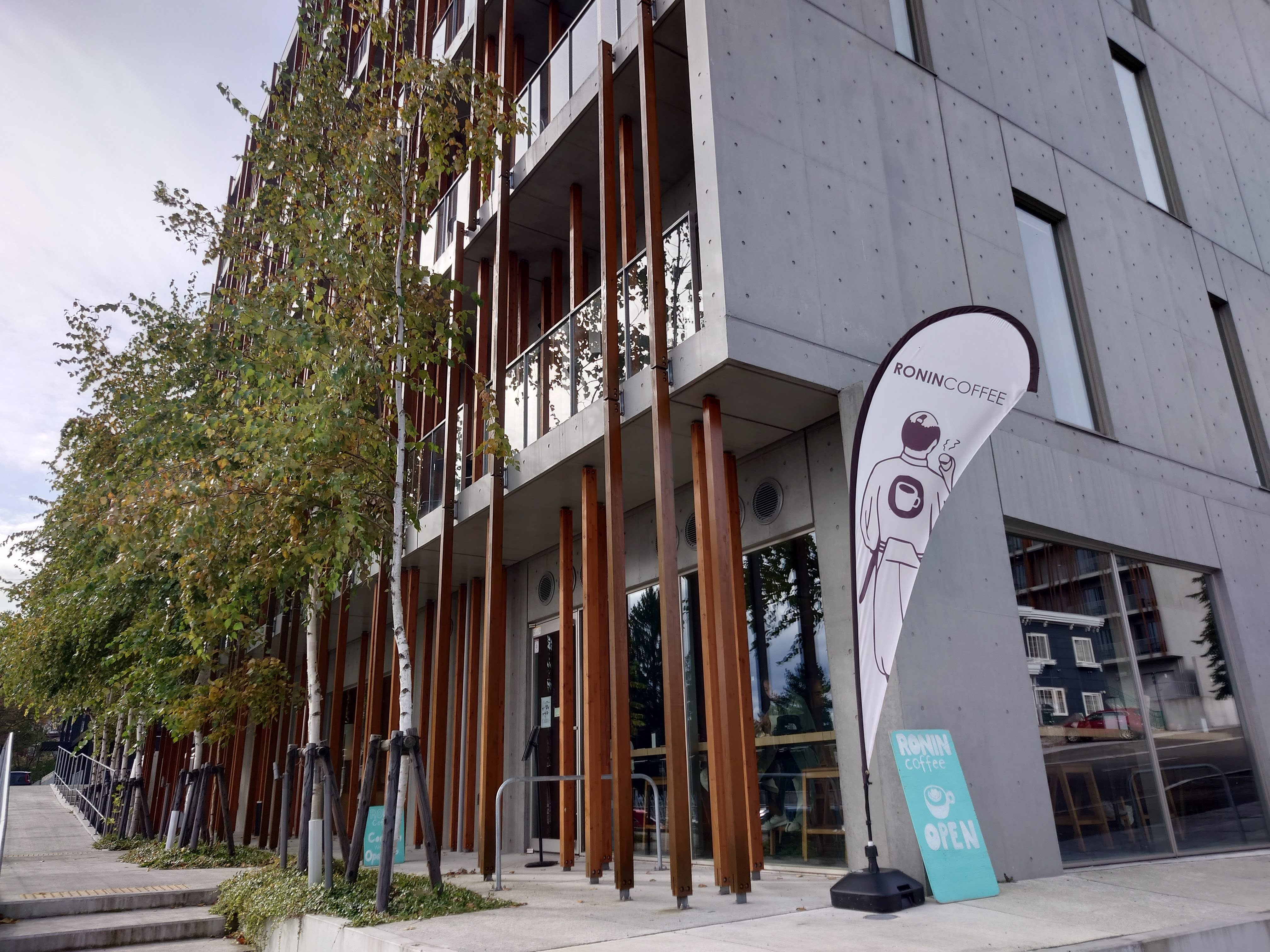 富良野市北の峰町にある「RONIN Coffee」(ロニンコーヒー)。ここは営業が朝7時半からとオープン時間が早く、朝食も楽しめます!もちろんホテルの朝食も良いけれど、たまには早い時間から、散歩がてら朝の空気を感じながら、良い景色を眺めつつ、お出かけするのもオススメです。もちろん駐車場もあります。