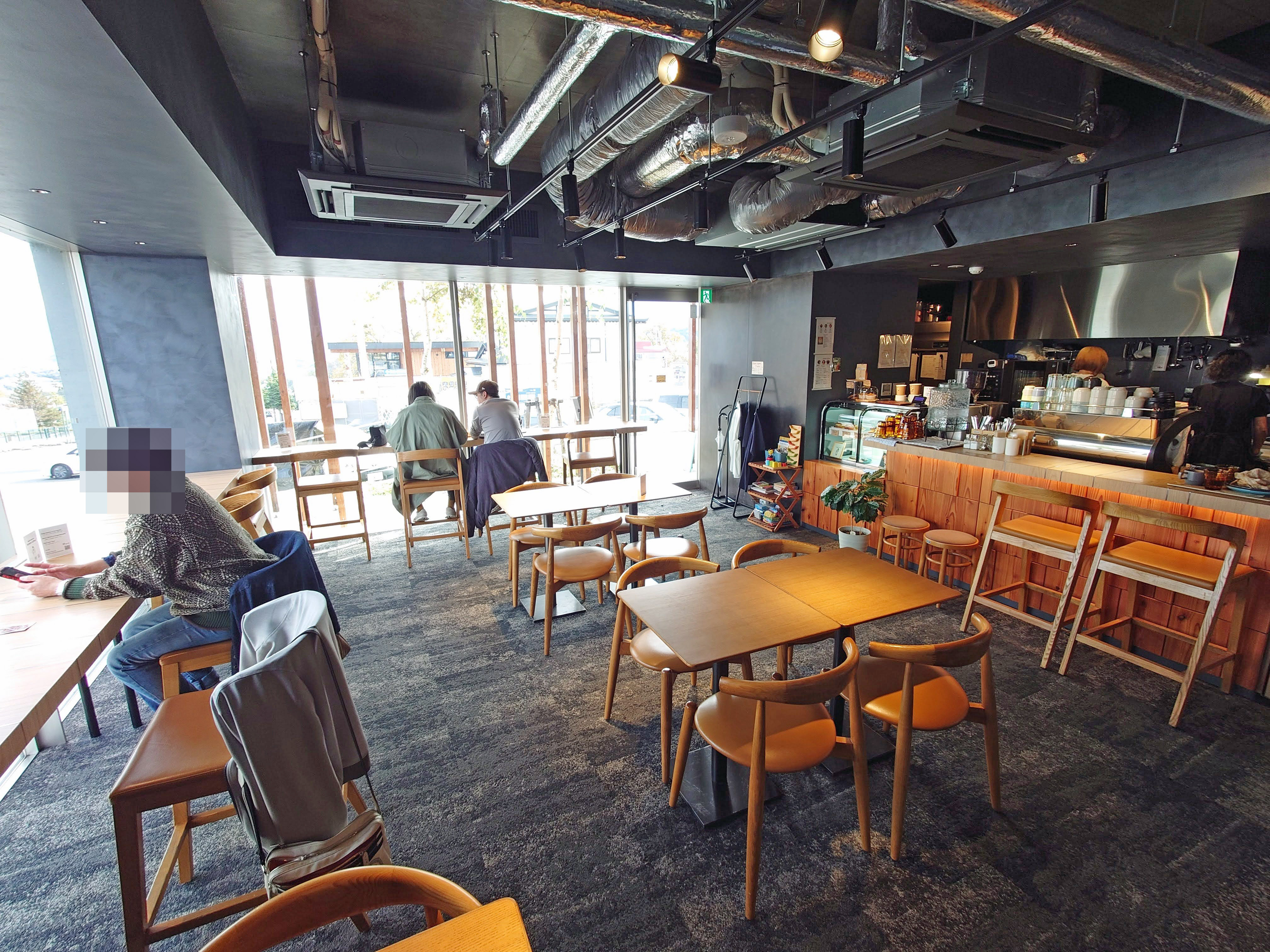 外の景色を満喫できる、大きな窓が印象的な店内。外を眺めながら、ゆったり過ごせる窓際のカウンター席が人気の様子。木目のテーブルと、丸みのある椅子がナチュラルで、温かみのある雰囲気を演出していて、落ち着いた色合いが、お店全体を柔らかく感じさせ、心地よく過ごせます。