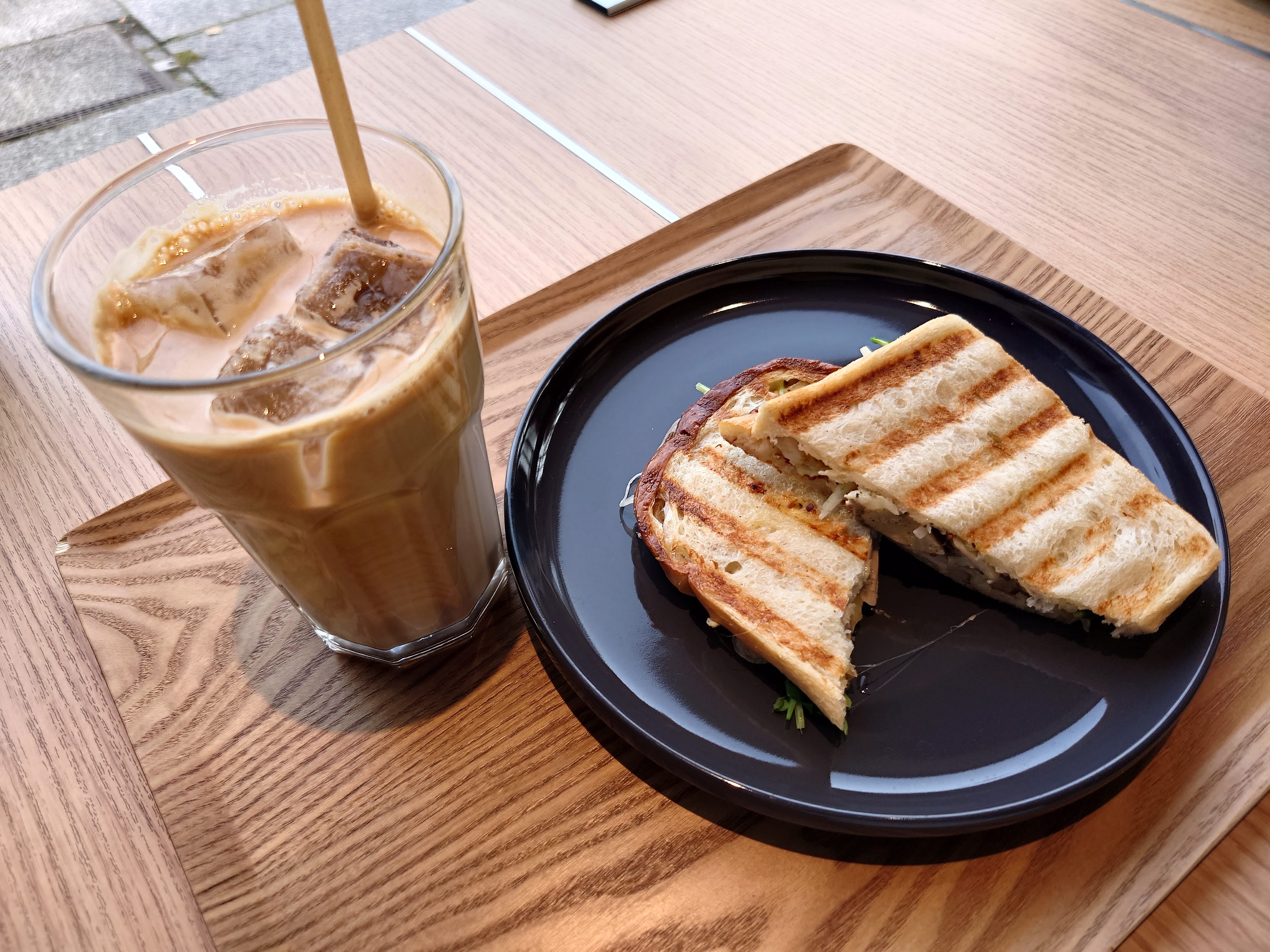 「ハニーマスタードホットサンド」を手に取った瞬間、ふんわりと甘いハニーの香りがよく、食欲をそそります。こんがり焼けたパンはサクッと軽い食感で、中にはジューシーなチキンと、とろけるチーズがたっぷりです。ハニーマスタードの甘みと、ほどよい酸味が絶妙で、後を引く感じが良いですね。カフェラテはミルクのやさしい甘さと、ほろ苦さがちょうどよく、ホッと落ち着く味わいでした。
