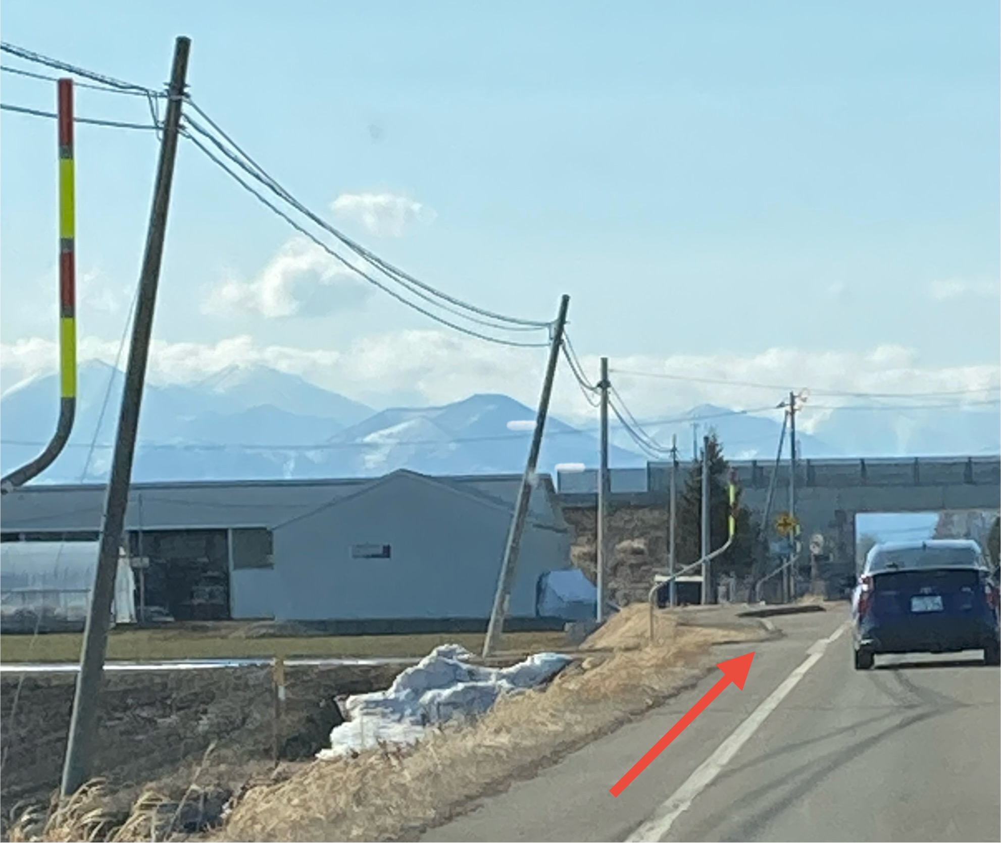 市街地方面を目指して進んでいると、一台の車が追い越して停まりました。(ココ)