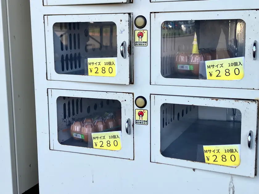 さすがたまごが特産の中札内!ずらりと新鮮たまごの自販機が並びます。