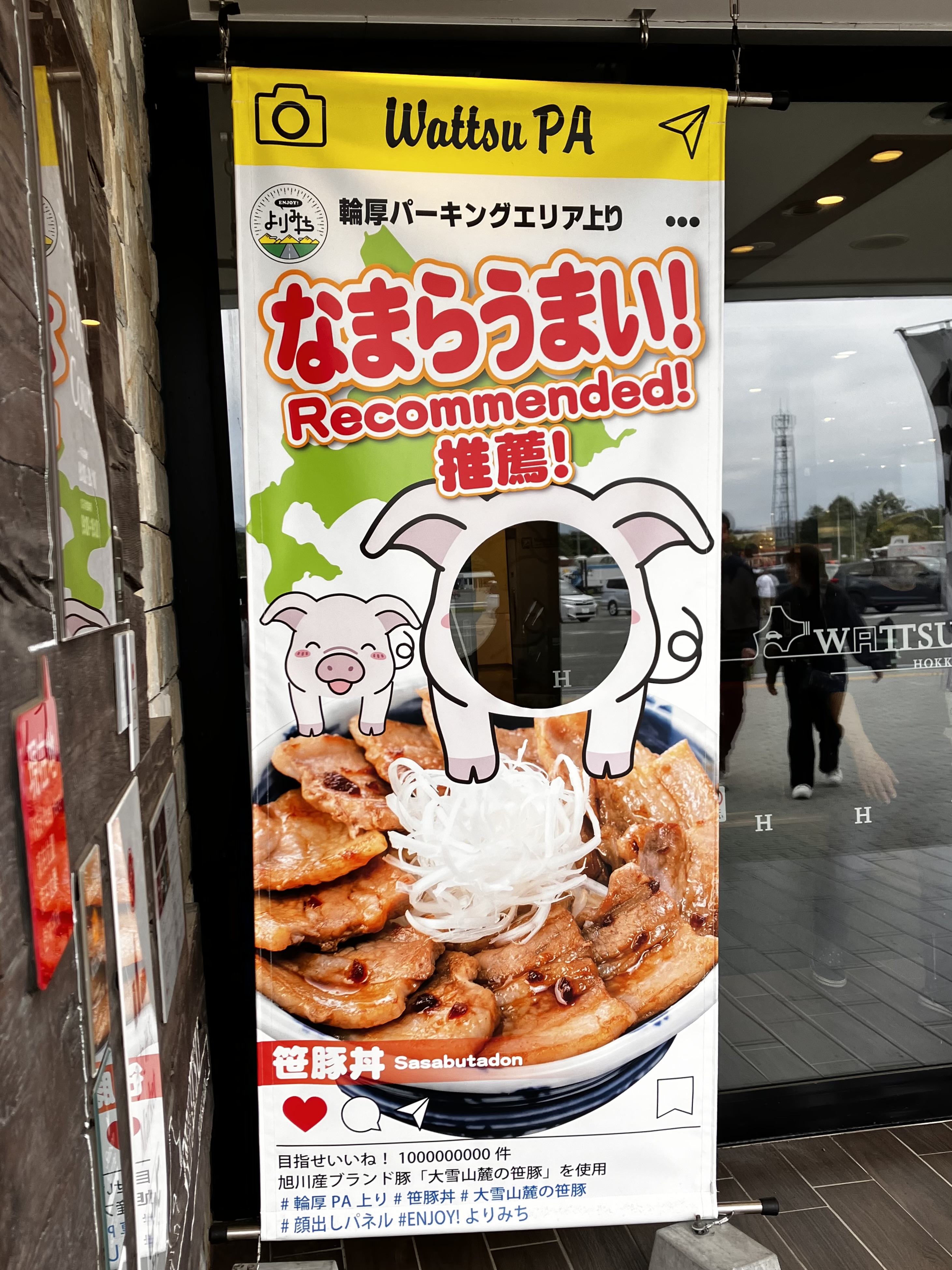 軽食・フードコート『きたみちフードコート』の人気メニュー「笹豚丼」の顔はめパネルは、パネルではなく建物から下がるタペストリー形でした。