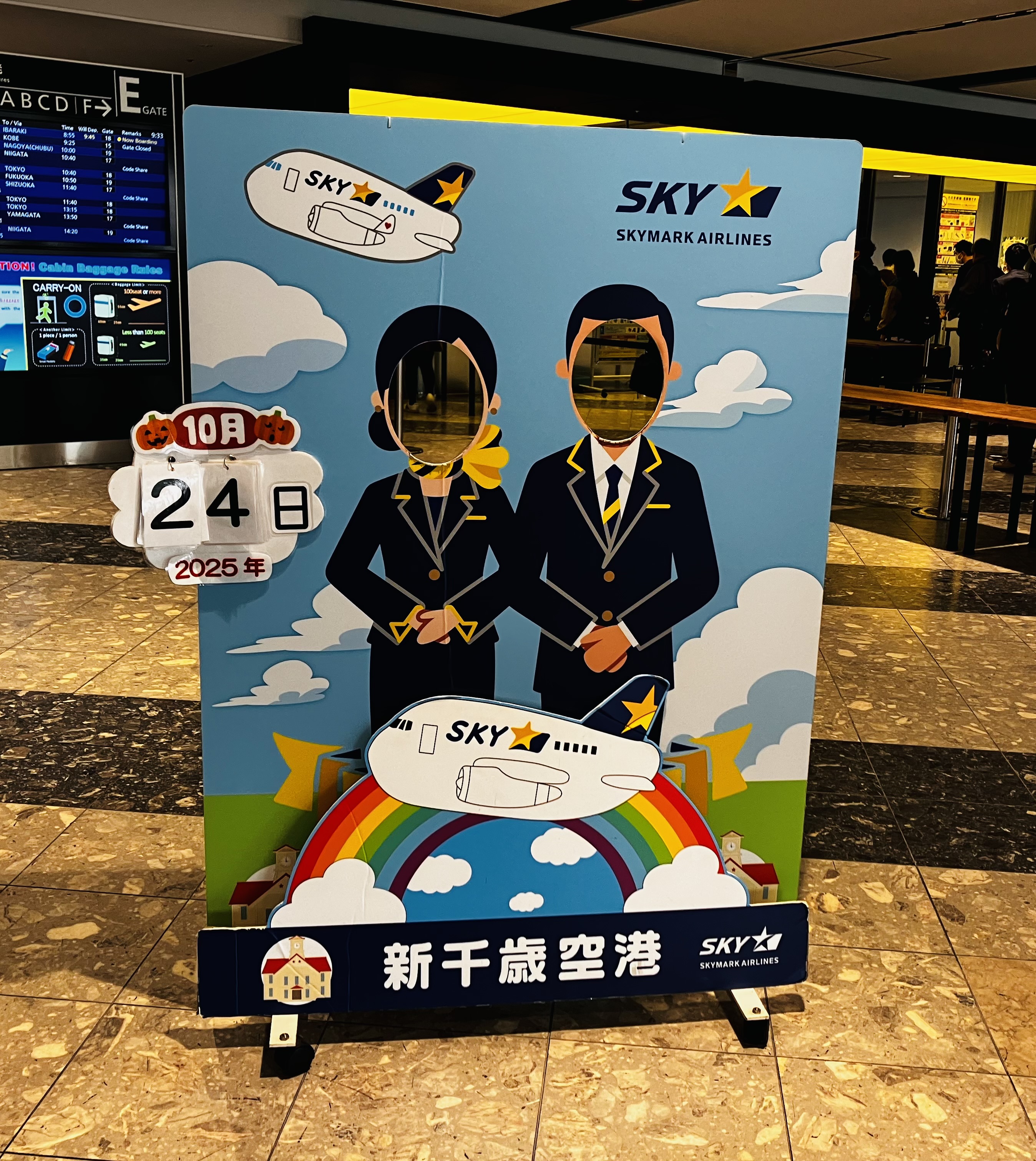 新千歳空港国内線ターミナルビル2Fスカイマークチェックインカウンター横に、礼儀正しく並ぶ男女の顔はめパネルを発見!ありそうであまり無い日付入りのタイプです。制服姿で凛々しく美しい記念の1枚をどうぞ。