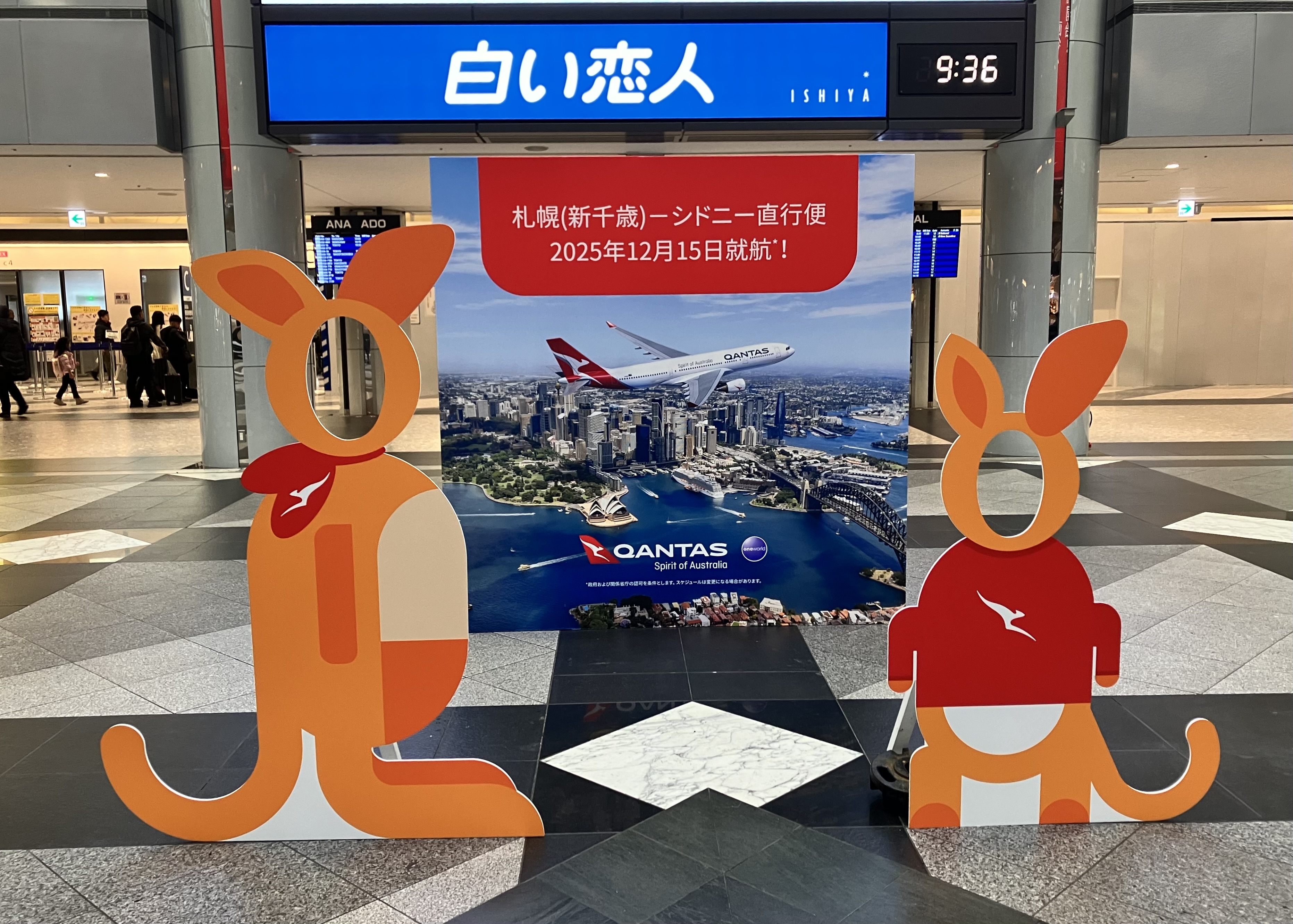 2025年12月15日 札幌(新千歳)ーシドニー直行便が就航する記念に設置されていたQANTAS(カンタス)航空のカンガルー顔はめパネルを発見!オーストラリアのシドニーでは、野生のカンガルーに出会える場所があるそうです。ママカンガルーのポケットにチビッコカンガルーが入ってるところ、見てみたいなぁ。
