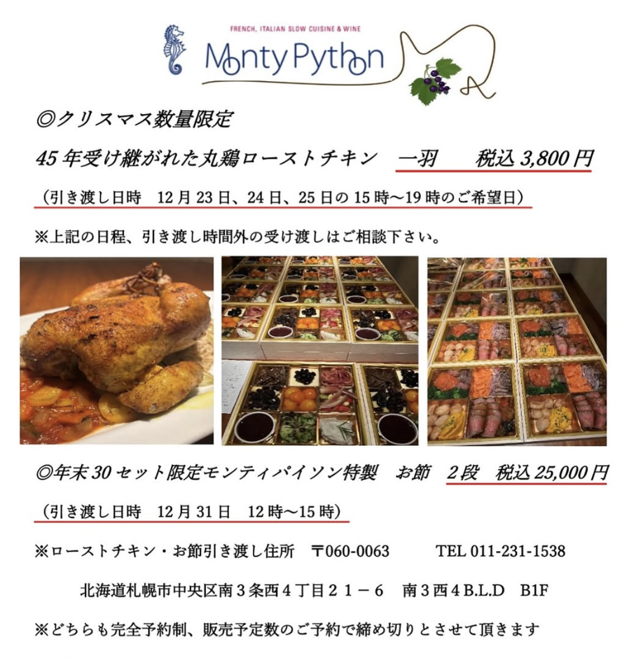 1980年創業の老舗ワインバー「モンティパイソン」。豊富なワインのラインナップはもちろん、本格的なフレンチ・イタリアンをベースとした創作料理が長年に渡り愛されてきた理由でしょう。特に「海苔パスタ」、「ハーブを効かせた活ダコの炭焼き」などは鉄板メニューです。クリスマス時期の「丸鶏のローストチキン」とともに、毎年この時期に予約販売されている「特製お節」は10品以上が入った二段重。毎年楽しみにして予約済みの方が多く、残りは少ないようなのでお早めに!