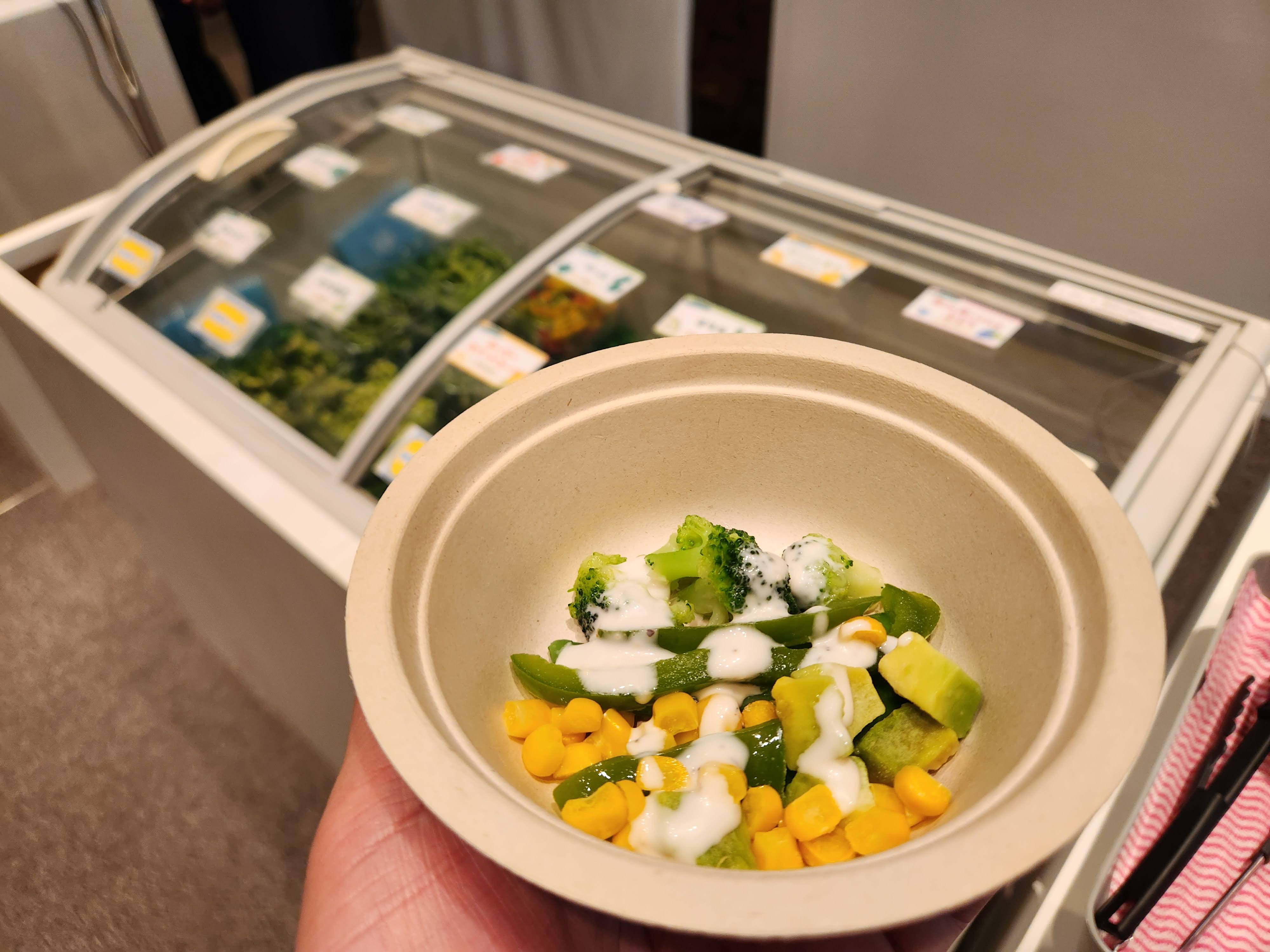 イベント初登場の、冷凍野菜やフルーツを自由に盛ってチンして作る「チン!するサラダバー」。サラダバーのおかげで、肉・炭水化物中心になりがちな構成を一度リセットしてペースを作れるので、90分楽しみきるのに結構重要。