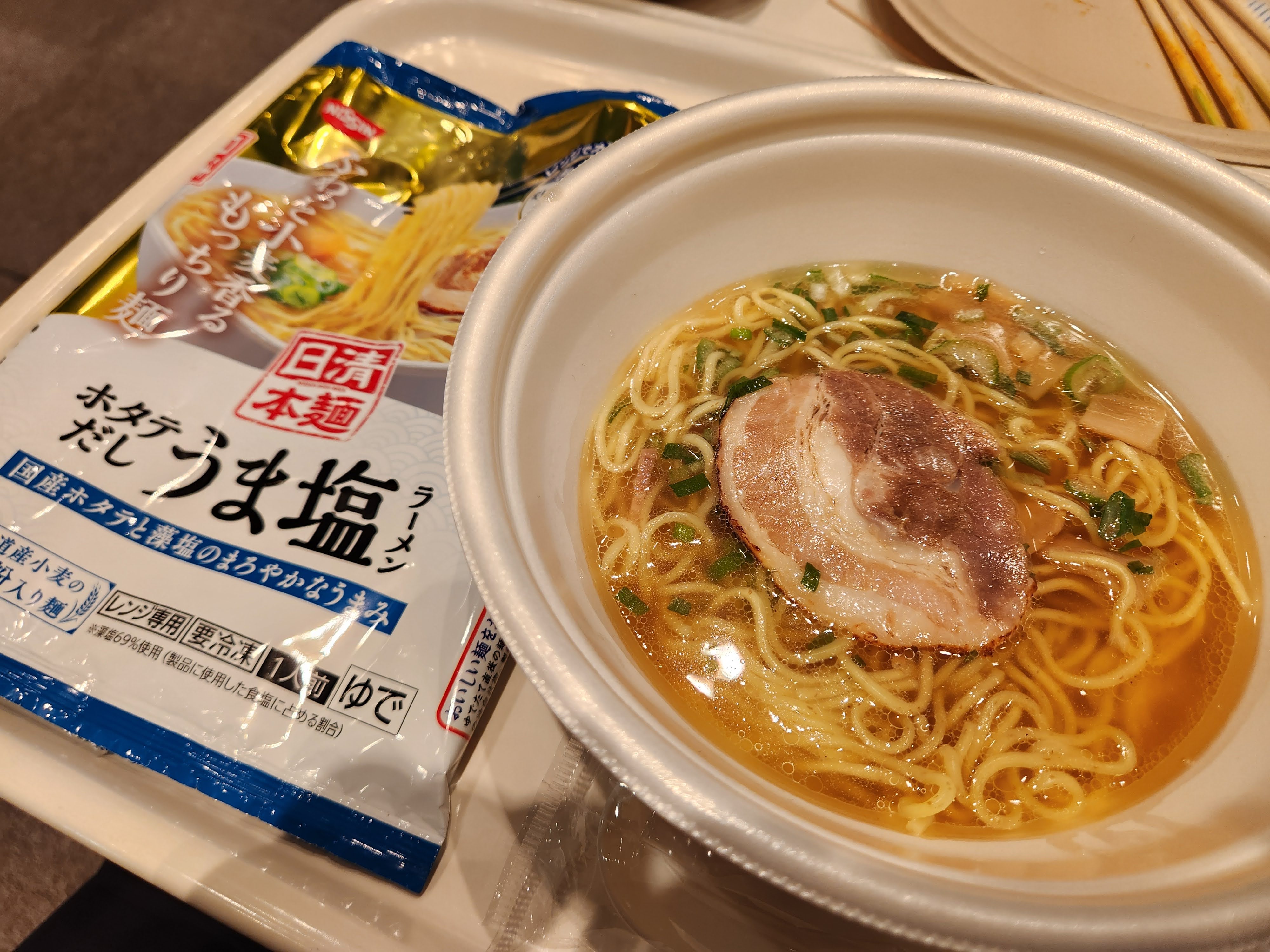 後半30分で、調理方法をじっくり読んで作った日清「うま塩ラーメン」。麺の温めとは別に、お湯でスープを溶くひと手間かかる手順でしたが、美味しく出来ました。満足!