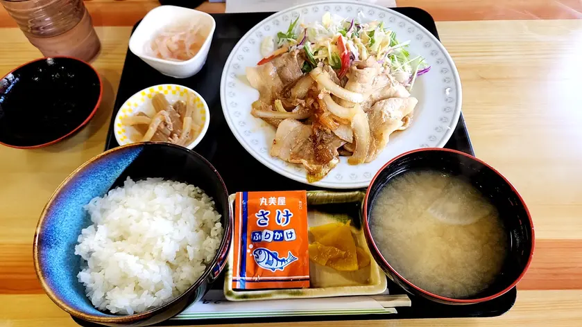 ご飯は大きめのお茶碗いっぱいでふっくら、味噌汁も出汁がきいてる。