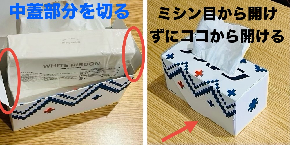 上面に穴を開けてソフトパックティッシュを2段入れるだけ!我が家では多少補修しながら1年近く使用できています(^^)
