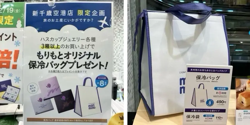 季節限定品を含め、ハスカップジュエリーなど3品購入で【通常490円(税込み)で販売しているオリジナル保冷バッグ】がもらえるサービスがあります!(新千歳空港店限定の特典)年末年始のご進物などにいかがでしょうか?