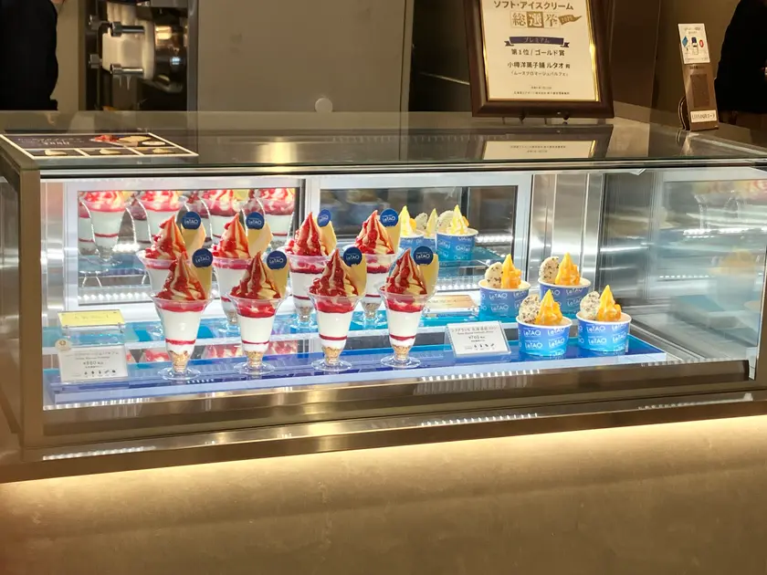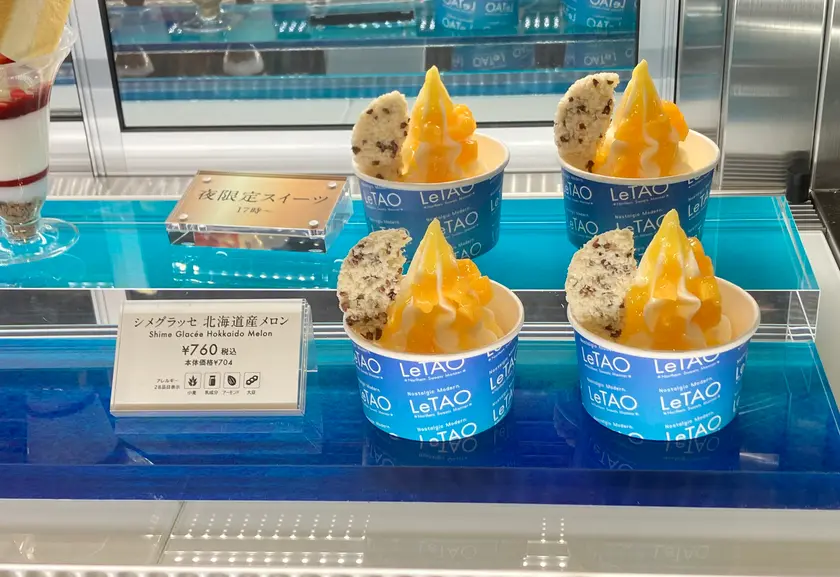 ジャージーミルクソフトに、華やかな香りが広がるルタオオリジナル赤肉メロンソースと空港店限定の「まああるブランシェール」がトッピングされた「シメグラッセ~北海道産メロン~」は、お食事や旅のシメに楽しめるようにとつくられたそう。