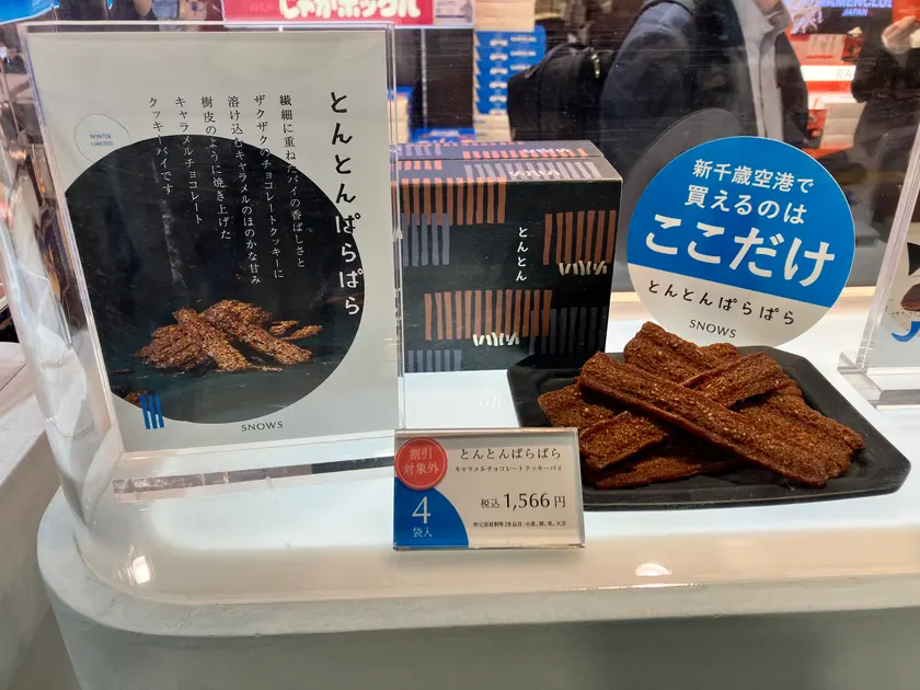冬季限定の大人気スイーツ「SNOWS」は11月1日(土)から、新千歳空港内では4店舗で今シーズンの販売が始まりました。2026年4月30日(木)までの冬季限定発売です。その仲間に、新商品のキャラメルチョコレートクッキーパイ『とんとんぱらぱら』が加わりました。