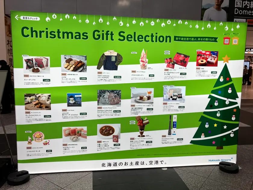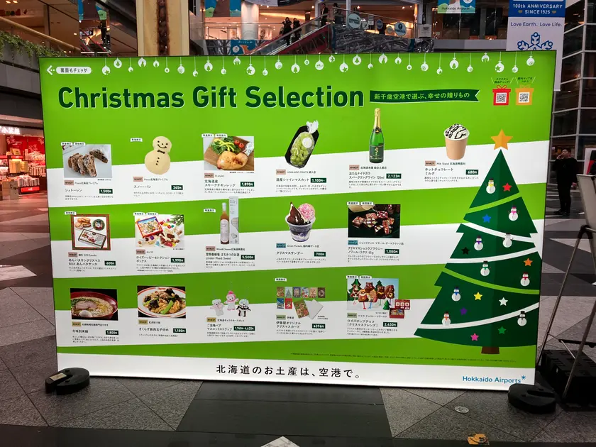 まず見ていただきたいのは、国内線ターミナルビル2Fのセンタープラザ(広い吹き抜け空間のところ)に掲示されている「Christmas Gift Selection」の紹介ボードです。各店舗でクリスマス関連の新商品や期間限定商品が発売されていますので、要チェックです。