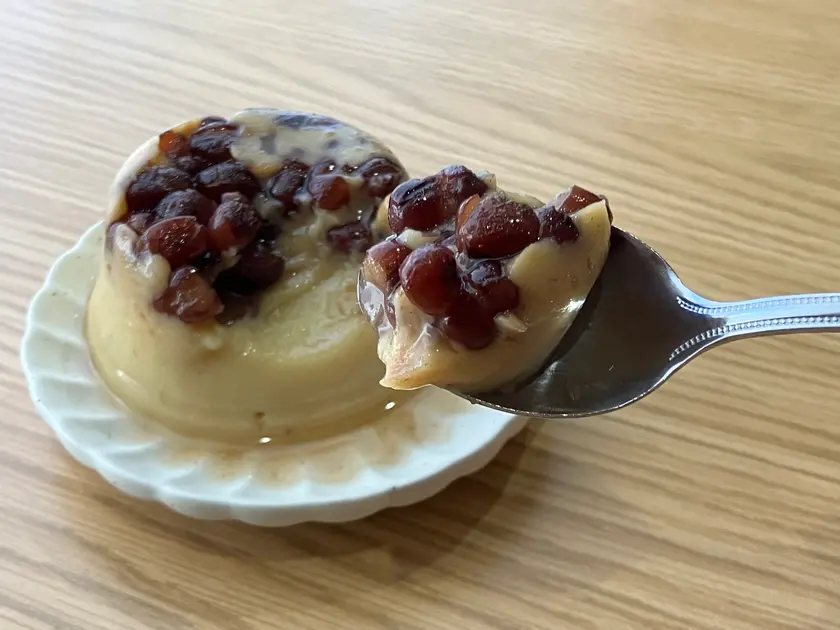 材料は道産さつまいも&千歳産大納言小豆など。プリンは焼き芋風味で、甘く煮た小豆がカラメル的存在となっています。