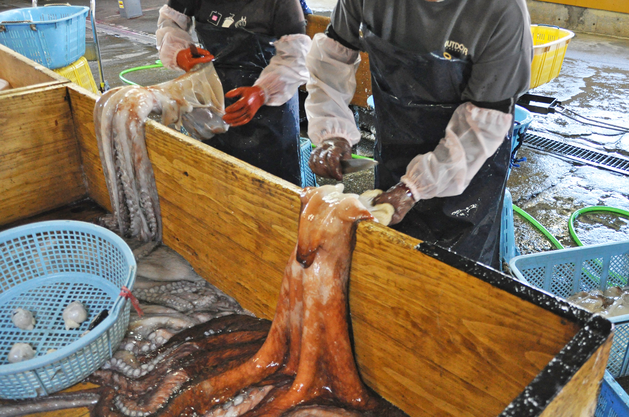 水揚げされたタコは、休む間もなく加工場に運ばれ最初に行われるのが、頭を割って内臓(ゴロ)を取り除く『下処理』です。