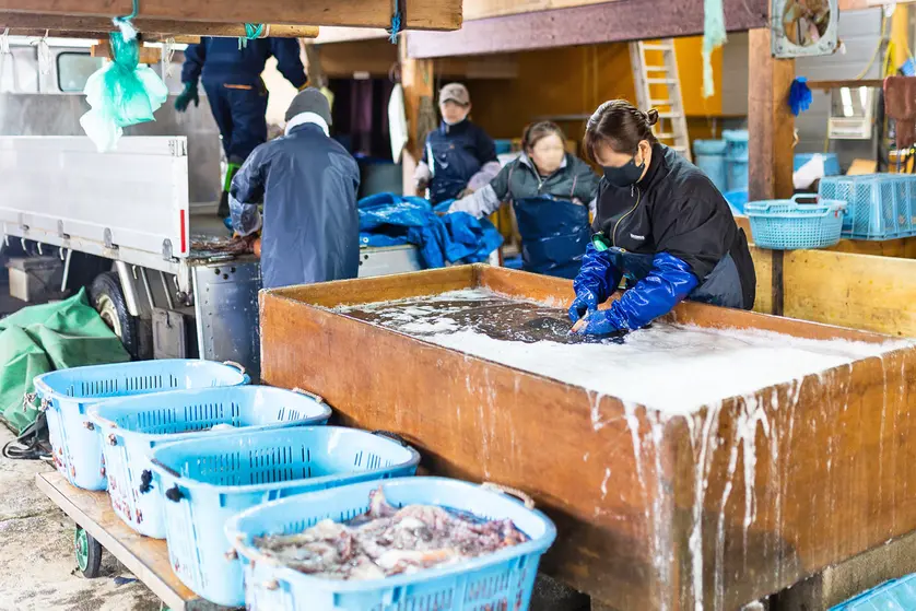 この下処理は、作業の中でも特に神経を使う工程だと言います。足は4本ずつ揃え、5本や3本になったりといった不揃いが出ないように一本一本を確認しながら切り分けていきます。