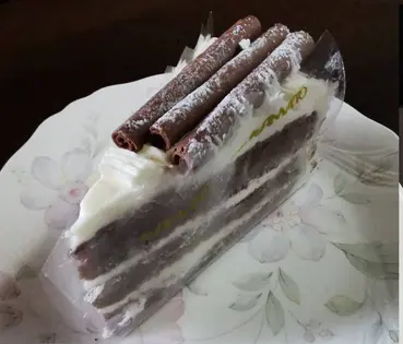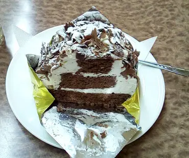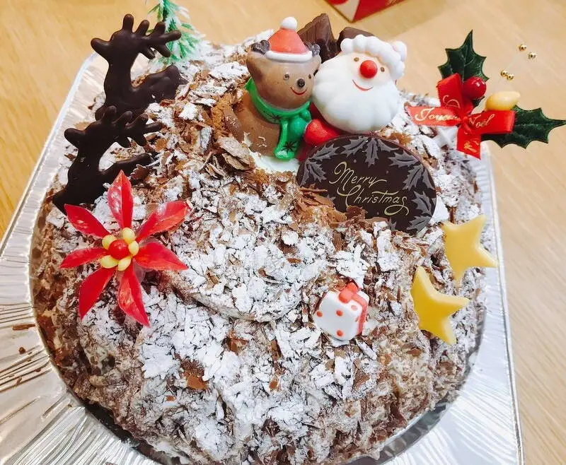 ココアスポンジを岩肌に、生クリームを雪に、削りチョコを岩肌に見立てたケーキなのです!