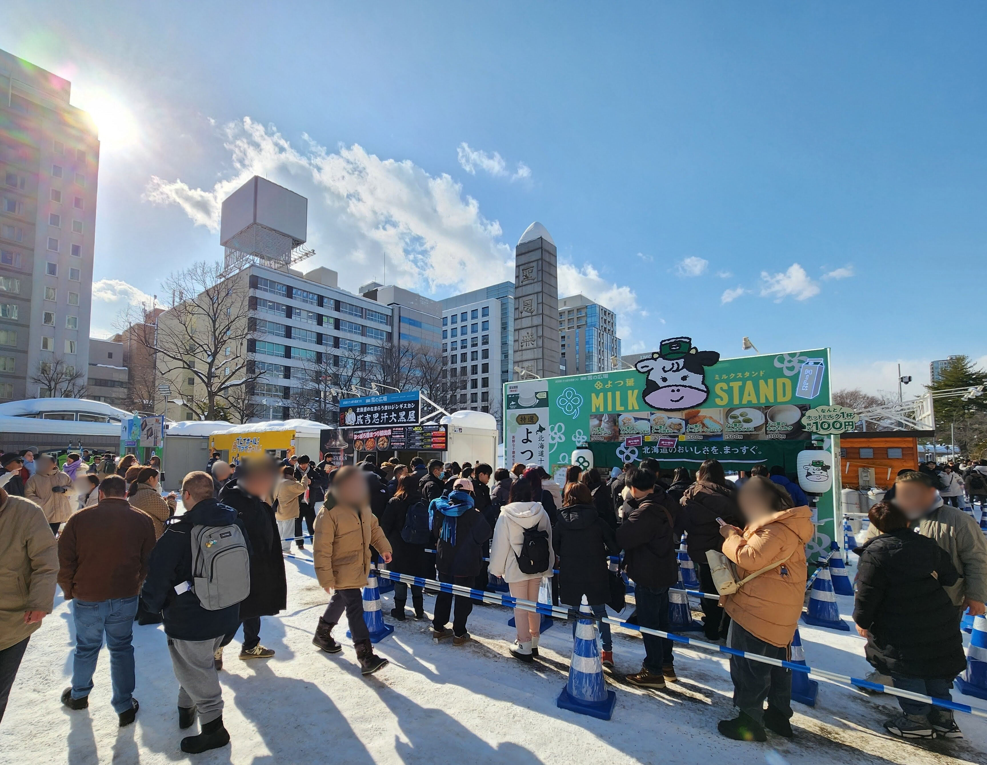 サントリー「幸せの角ハイボール」特設ブースは、大雪像に背を向ける形で並ぶ飲食ブースの一角に位置しています。横には北海道を代表する酪農会社 よつ葉の「ミルクスタンド」や旭川の人気ジンギスカン「大黒屋」などが並びます。