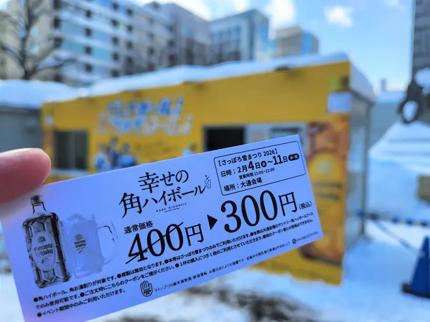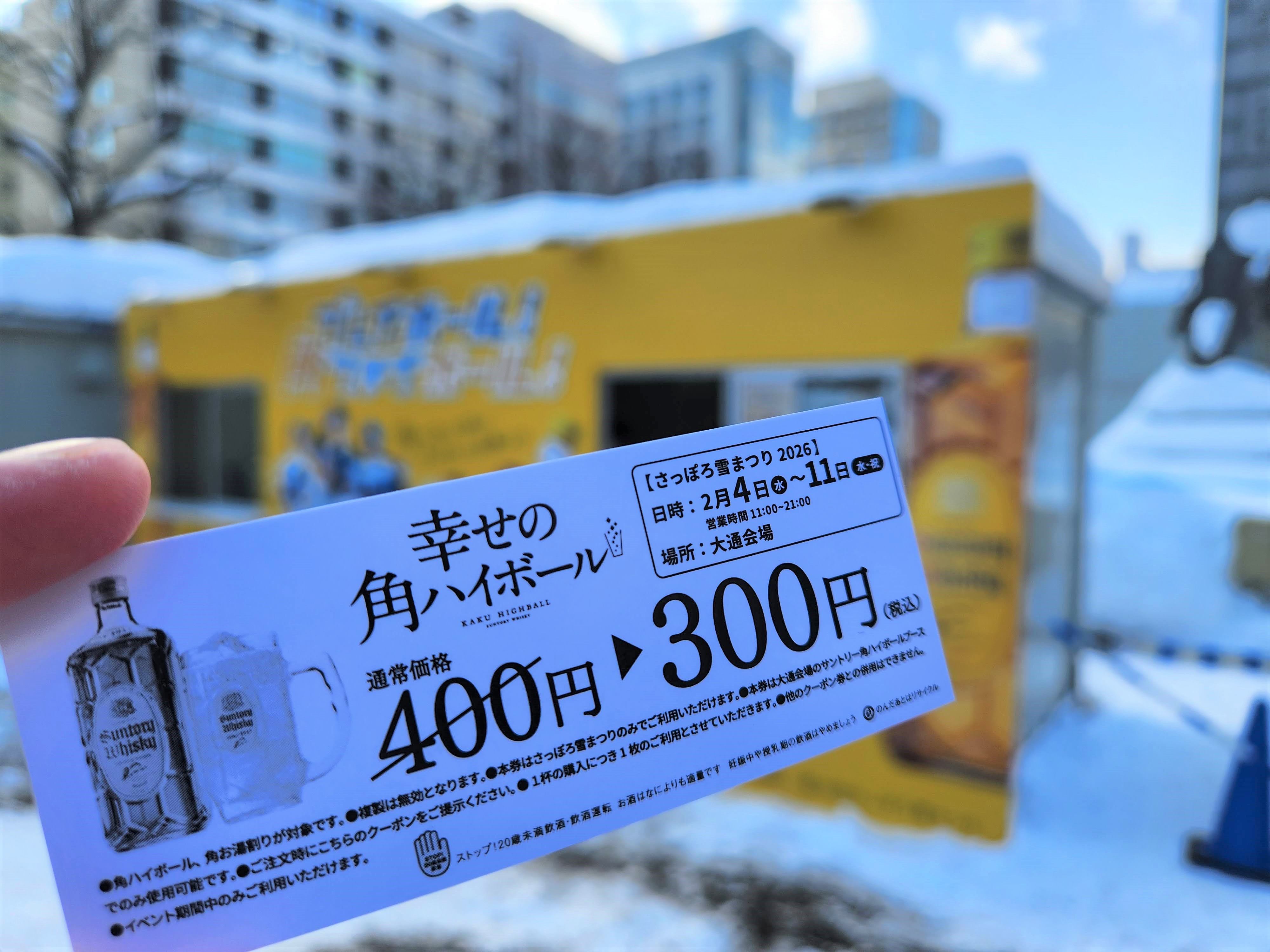 【2026さっぽろ雪まつり】角瓶が沁みる…5丁目会場「幸せの角ハイボール」現地レポート!100円引きで飲める?お得なキャンペーンも
