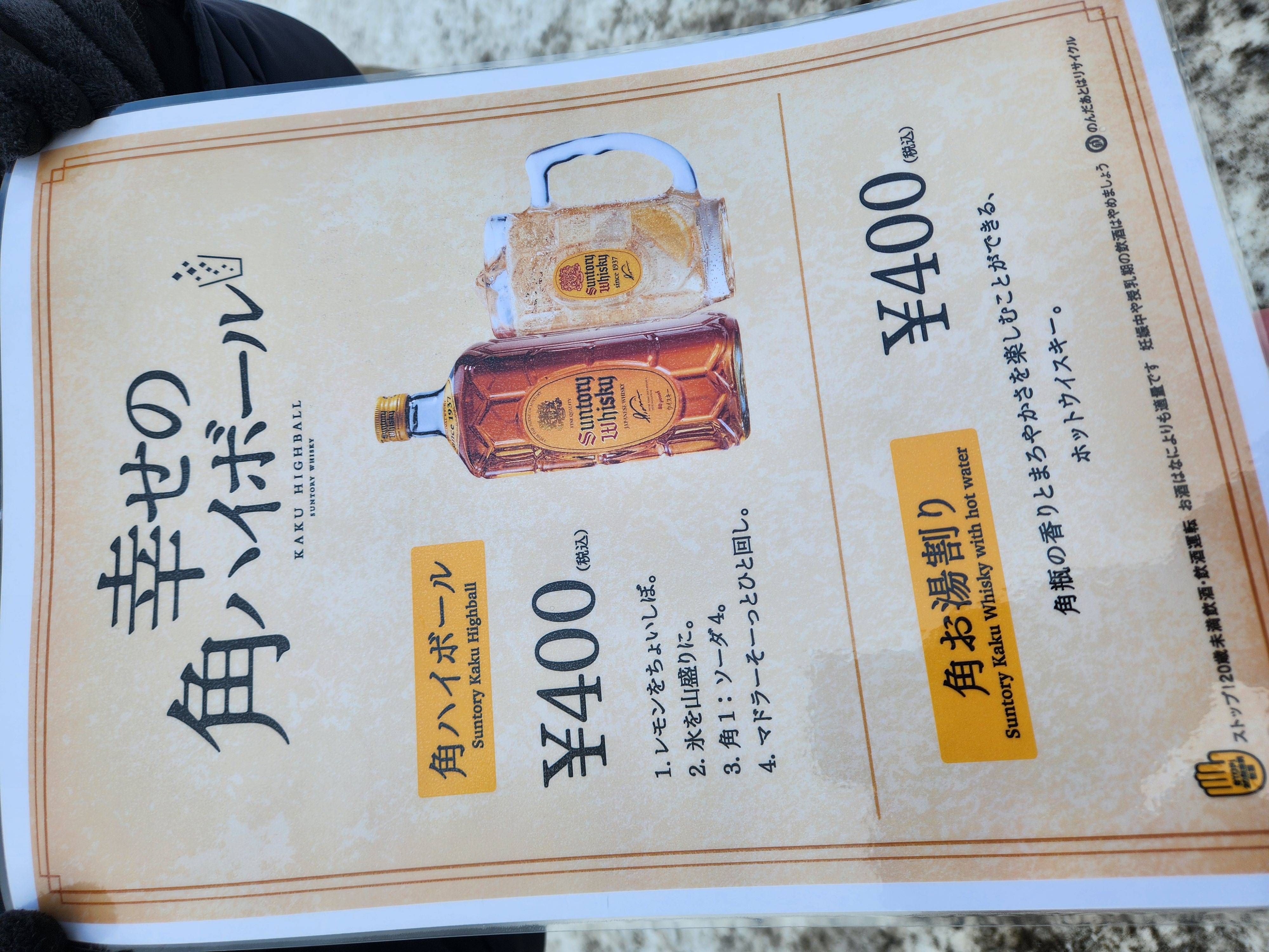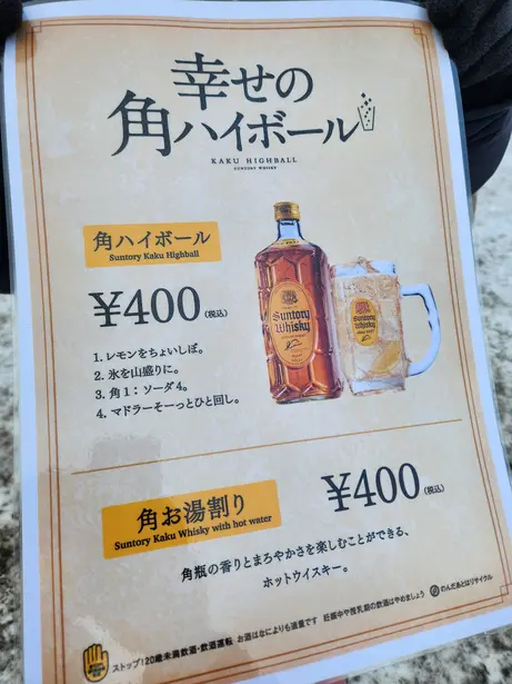 「幸せの角ハイボール」特設ブースで提供されている「サントリーウイスキー角瓶」メニューはこちら。