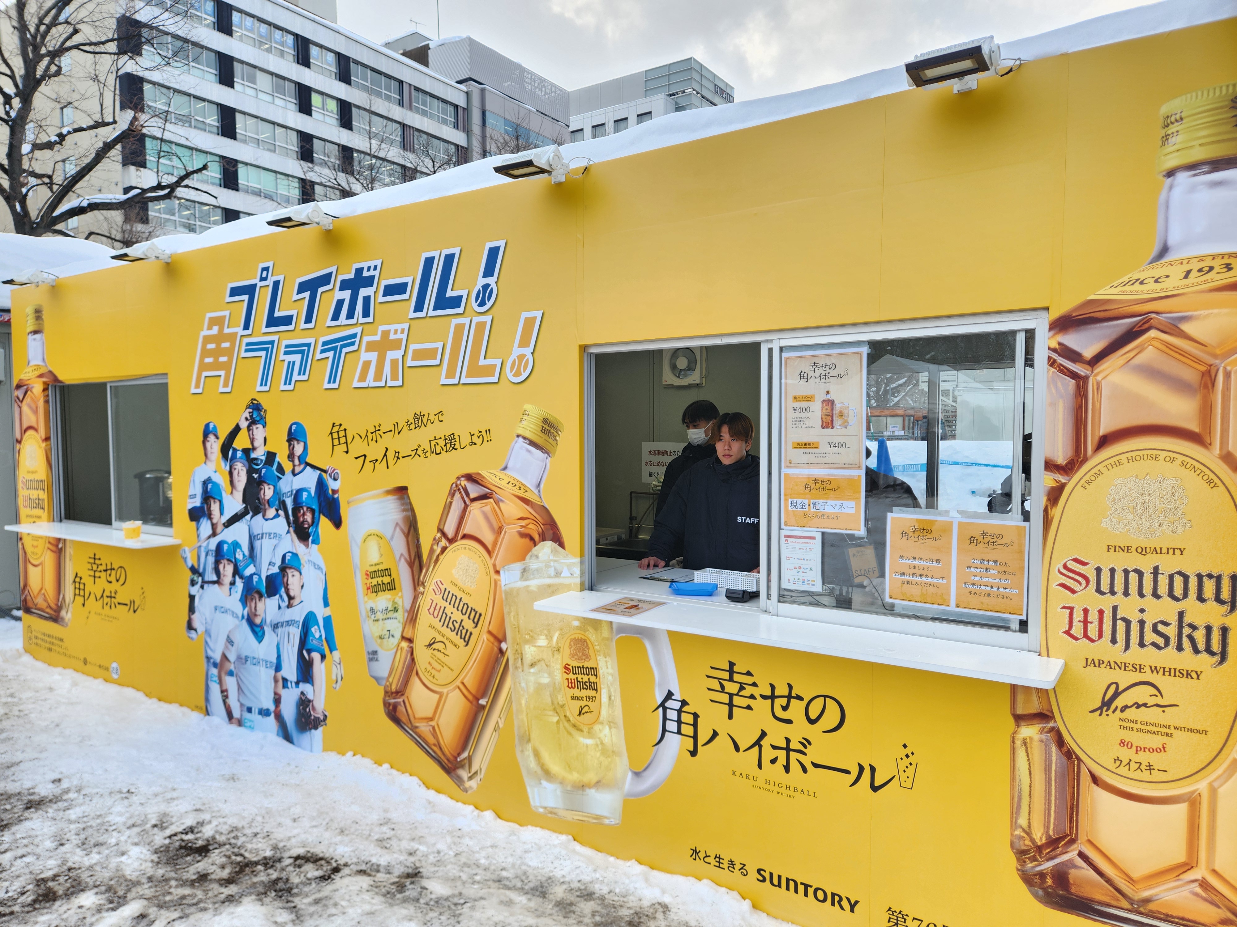 サントリー角瓶カラーの黄色とファイターズ選手が目立ち、雪景色の中でも自然と人を引き寄せている印象です。昨年まで同じ場所では「サントリー生ビール」を提供していましたが、今年は雰囲気がガラリと変わりました。