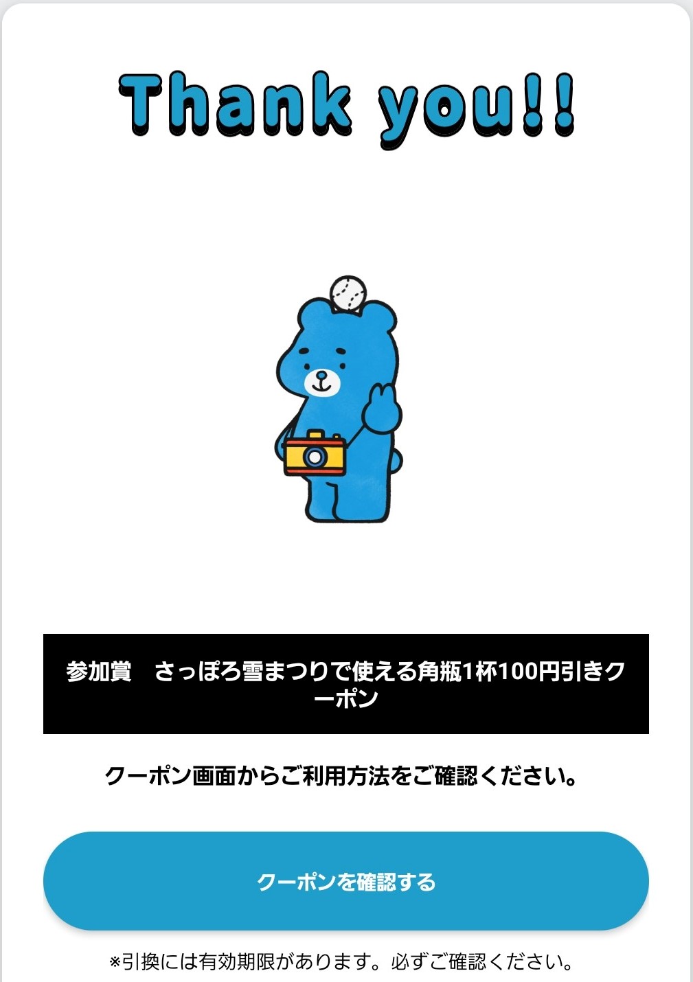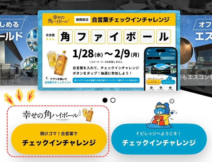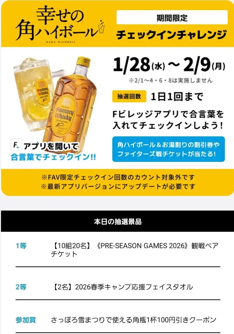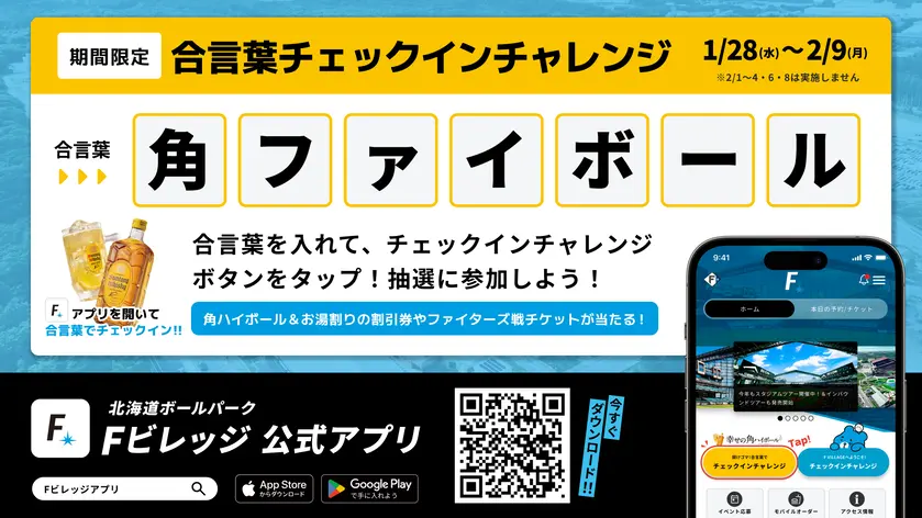 さっぽろ雪まつりと連動して、「北海道ボールパークFビレッジアプリ」での合言葉チャレンジを実施中!対象期間中、アプリをダウンロードし角瓶カラーの「チェックインチャレンジ」ボタンからキャンペーンに参加してください。合言葉『角ファイボール』を入力すると、その場で「さっぽろ雪まつりで使える角ハイボールまたは角瓶お湯割り 1杯100円引きクーポン」や「ファイターズ戦観戦チケット」などが当たります!