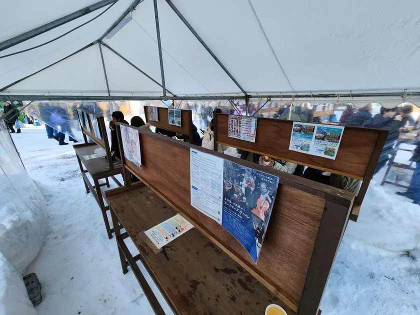 ちなみに、5丁目会場内には、イートインスペースが屋外・屋内それぞれ用意されていて、屋内テントは雪や風を避けながら飲食ができるので、キンキンの角ハイも進みますよ。