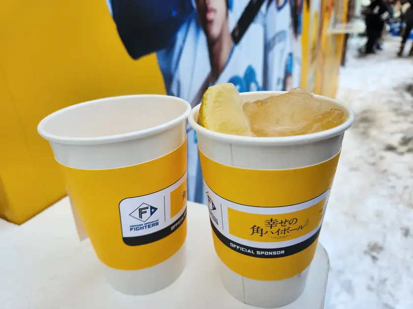 角ハイボールは、北海道日本ハムファイターズとコラボレーションしており、エスコンフィールド北海道でも販売されている一杯です。ドリンクカップにはファイターズと幸せの角ハイボールのロゴも並んでいます。
