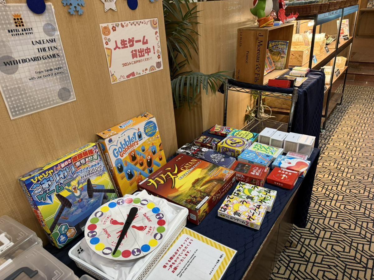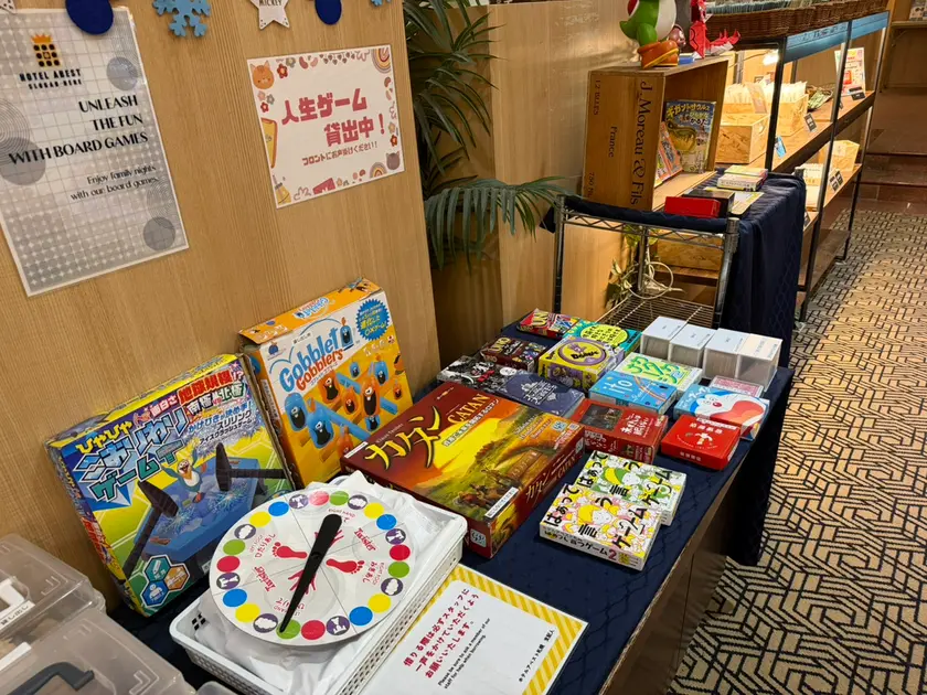 フロントではボードゲームやカードゲームなど、小さな子でも退屈しないゲーム類が貸し出されており、我が家も「黒ひげ危機一発」をお借りしました…!お部屋でゆっくり旅の疲れを癒したいけど、子どもは外に出たがる…という“子連れ旅あるある”も、このようなちょっとしたおもてなしで無事解決!非常に助かります。