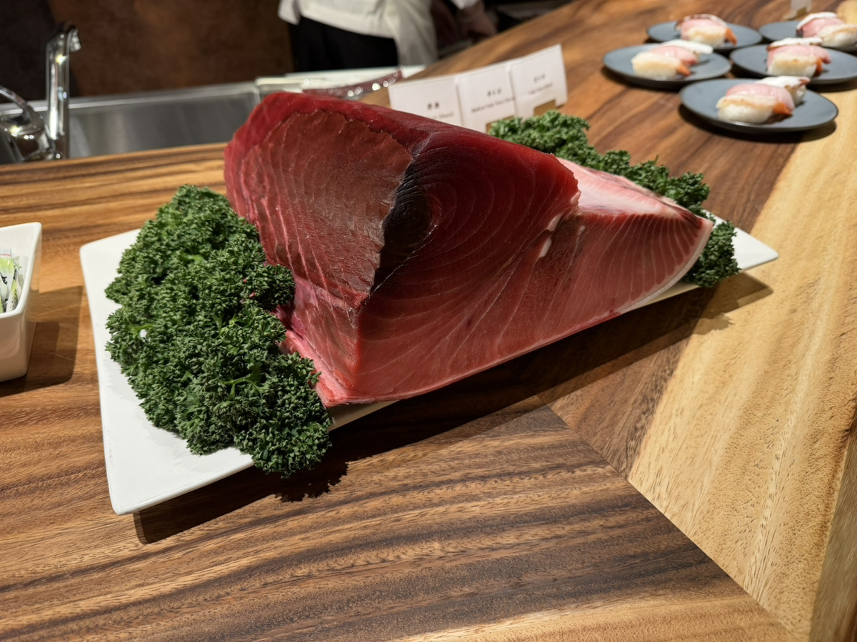こちらはライブキッチンにある、マグロの食べ比べコーナー。大きな塊のマグロは厳選された天然南マグロ。丁寧に切り分けられた、大トロ・中トロ・赤身を、一番美味しい状態で心ゆくまで堪能するという贅沢体験ができますよ。
