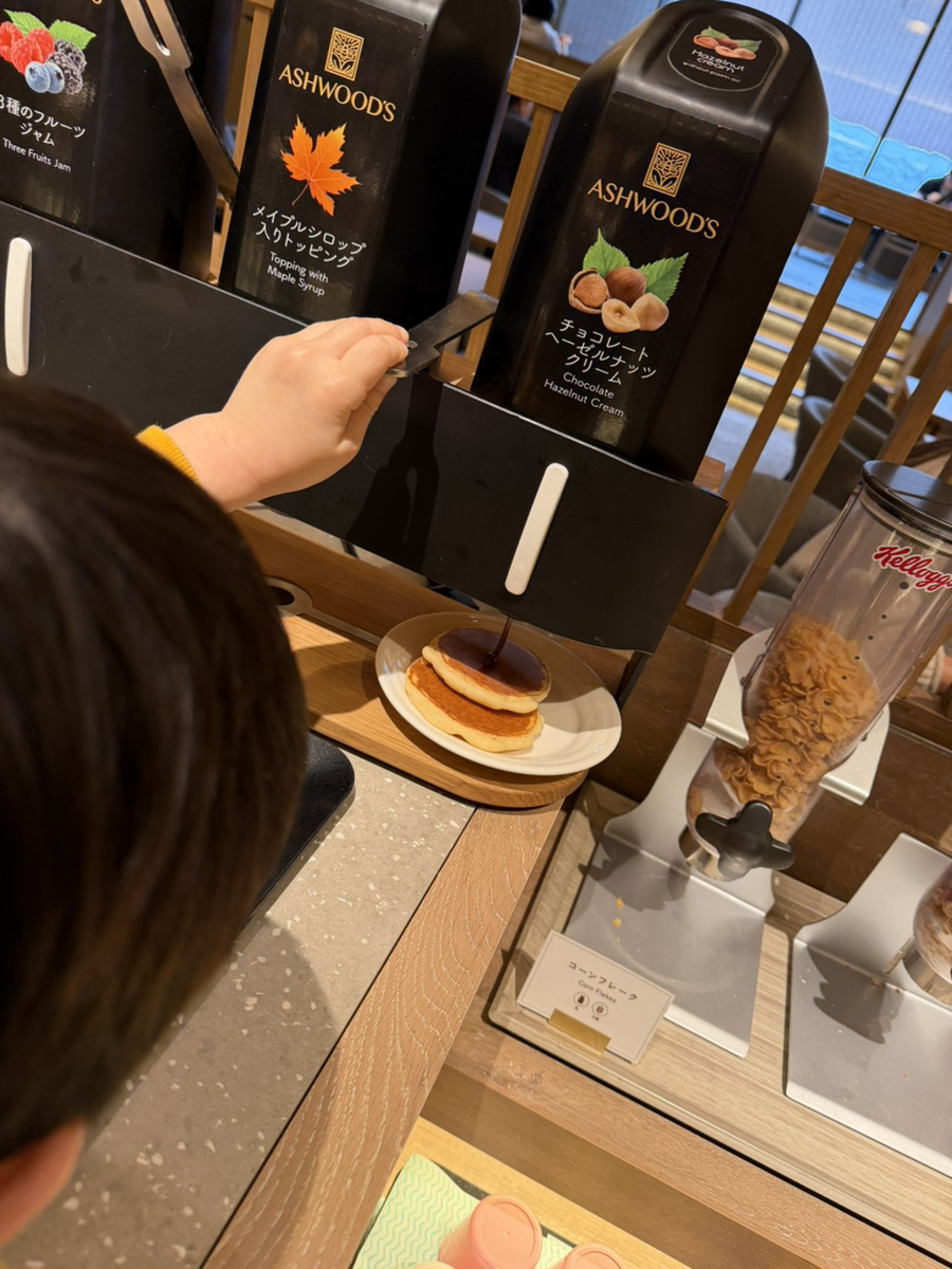 牧場しぼりの牛乳を使用したソフトクリームを贅沢にトッピング。ソフトクリームも自分でマシーンを使って盛り付けるタイプだったので、こちらも子どもが大喜び♪朝からとっても楽しい朝食の時間を過ごせました。