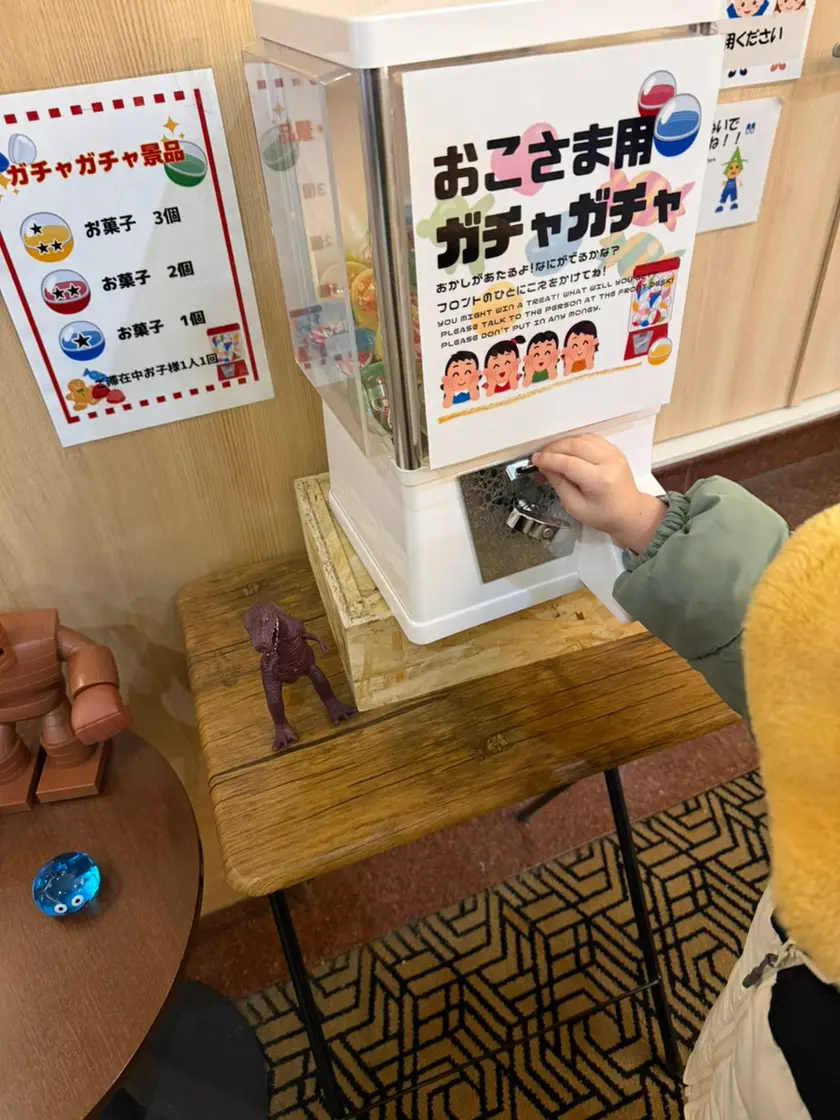 さらに滞在中、子どもが一人1回回せるガチャガチャも!お菓子をプレゼントしていただきました。こういったおもてなしで、ちょっとした待ち時間なども子どもが機嫌良く過ごすことができると、親としてはとってもありがたいですよね。子連れに優しいおもてなしに感謝感激です!