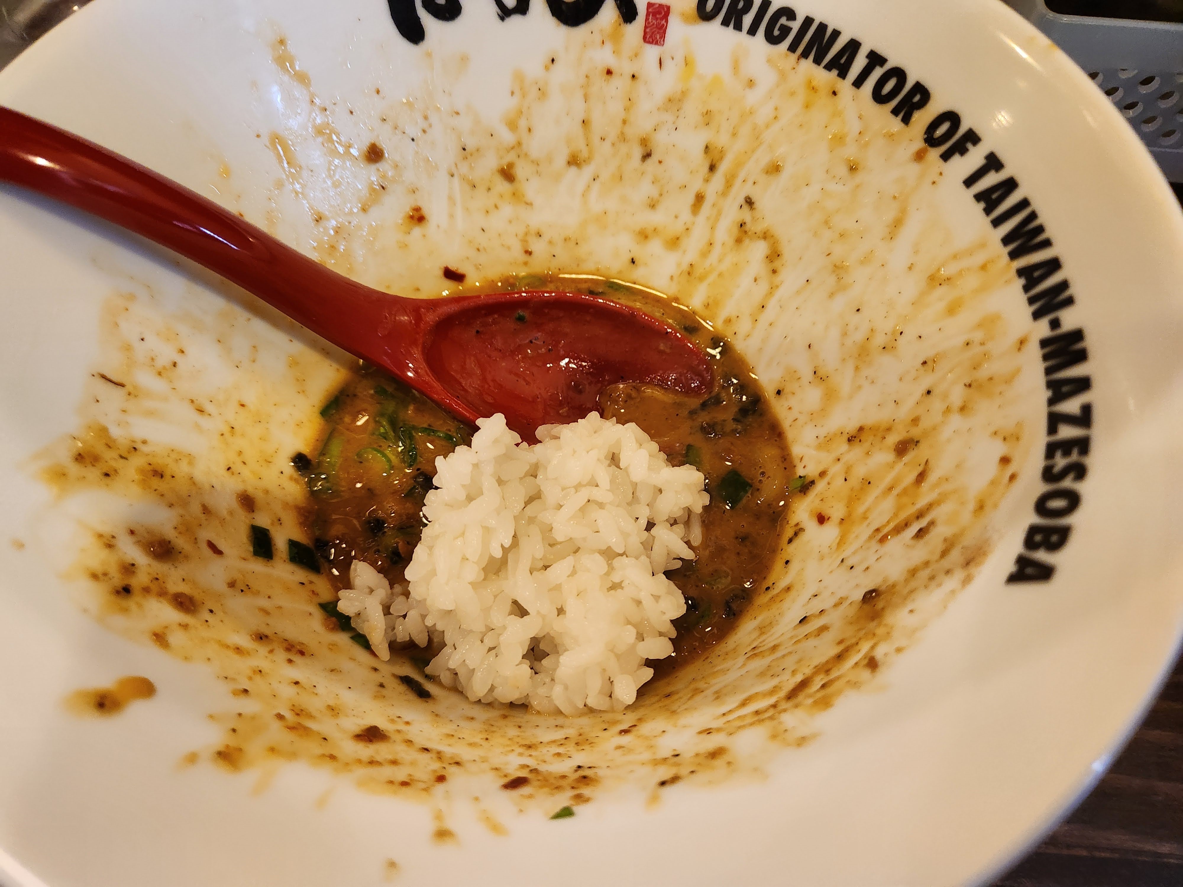 スタッフにお願いしてレンゲで2〜3杯ほどのご飯を追加。残ったタレやミンチ、ニラ・ネギに絡めて食べる追い飯は、麺以上に旨みが詰まっていて…これは絶品!〆の一杯まで、まったく残すことなく堪能できました。
