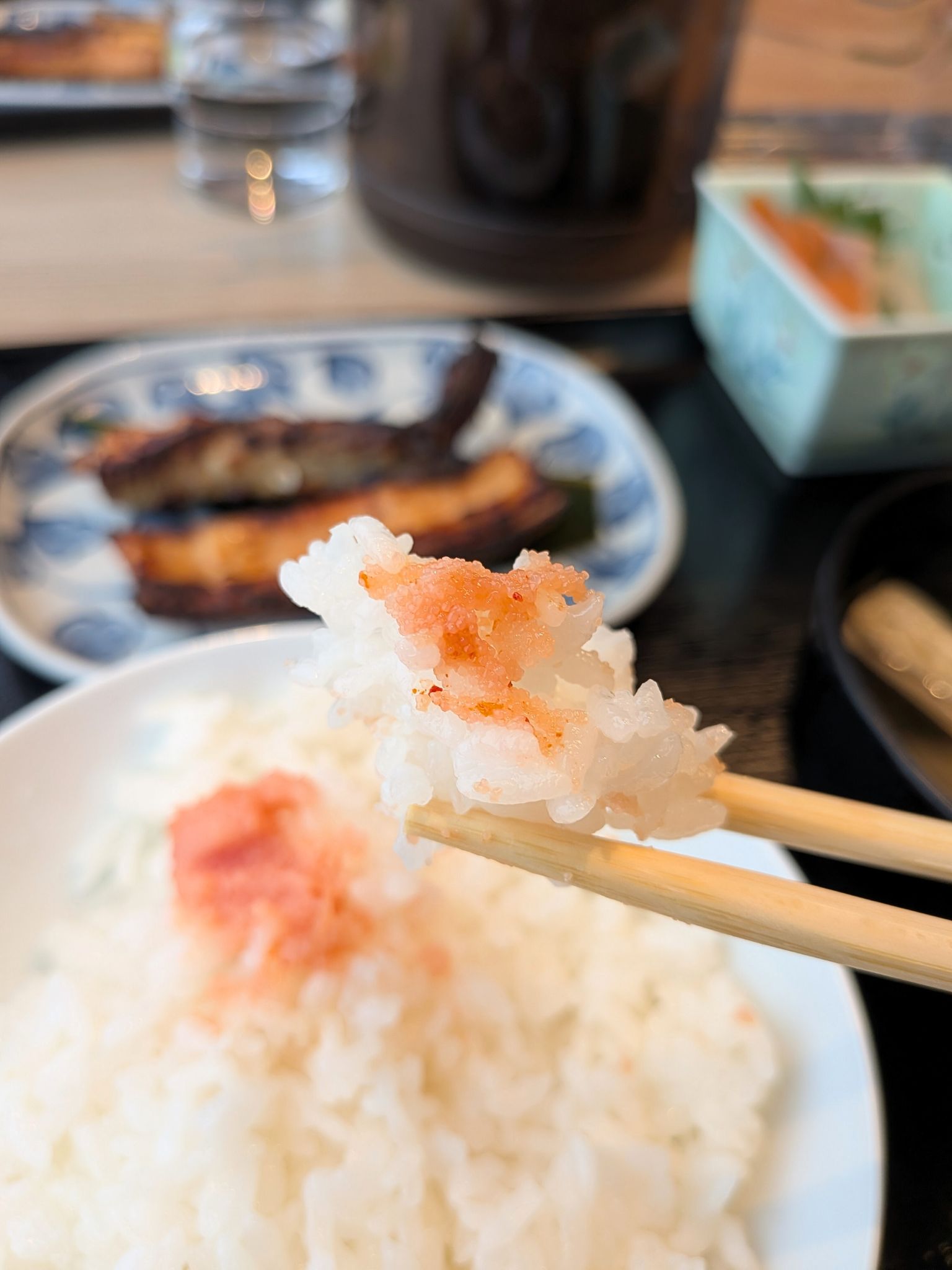 ふっくらと炊き上げられたご飯は、もっちりとした食感と上品な甘みが印象的。小鉢に添えられた一口サイズの明太子がほどよいアクセントとなり、つい箸が進みます。