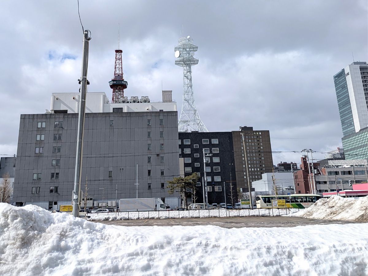 店舗を背にして西側を見ると、広いバス駐車場が広がり、その奥にはさっぽろテレビ塔の先端も見えます。