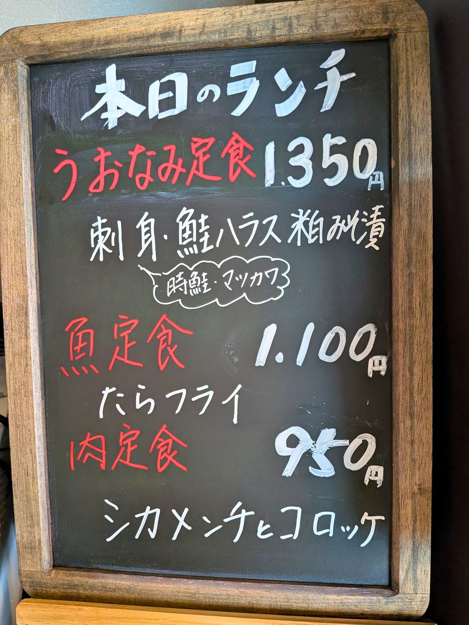 日替わりランチメニューは「うおなみ定食」「魚定食」「肉定食」の3種類。この日は「今ちょうどメニューを書いたところです」と、お店のママさんが笑顔でメニューボードを差し出してくれました。