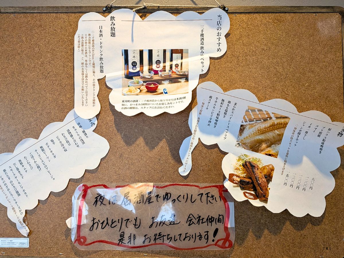 店内のボードにはディナーメニューも掲示されており、「三千櫻酒造飲み比べセット」などのメニューも確認できました。知床産の海産物や肉料理と合わせて楽しめそうです。