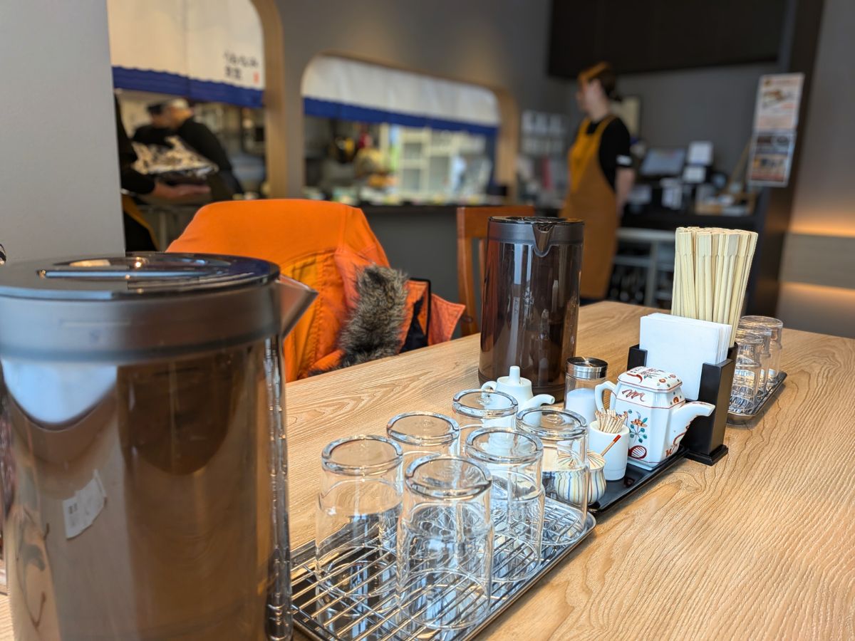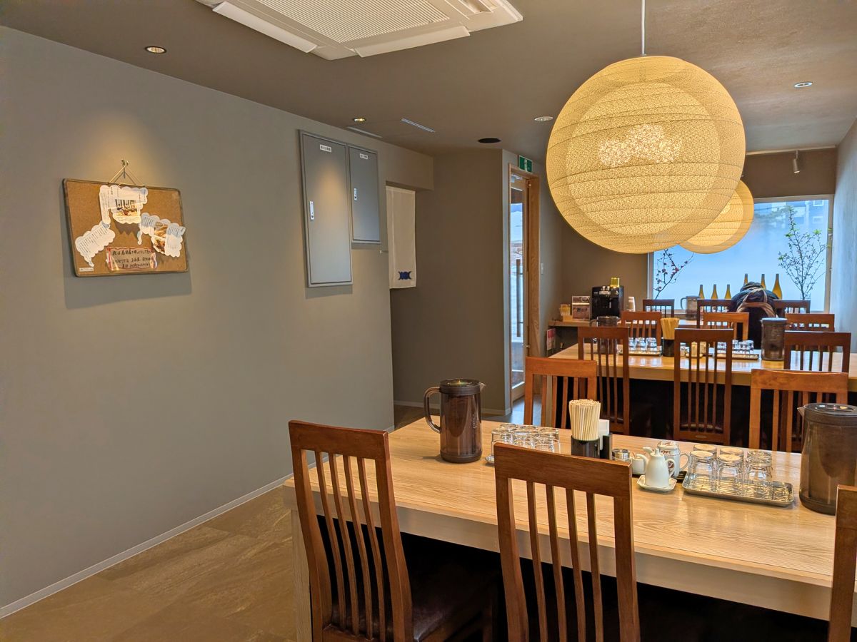 筆者と連れは、お刺身と鮭ハラスの粕みそ漬け焼きが楽しめる「うおなみ定食」(1350円)を選択。6名がけのテーブル席で料理を待ちます。
