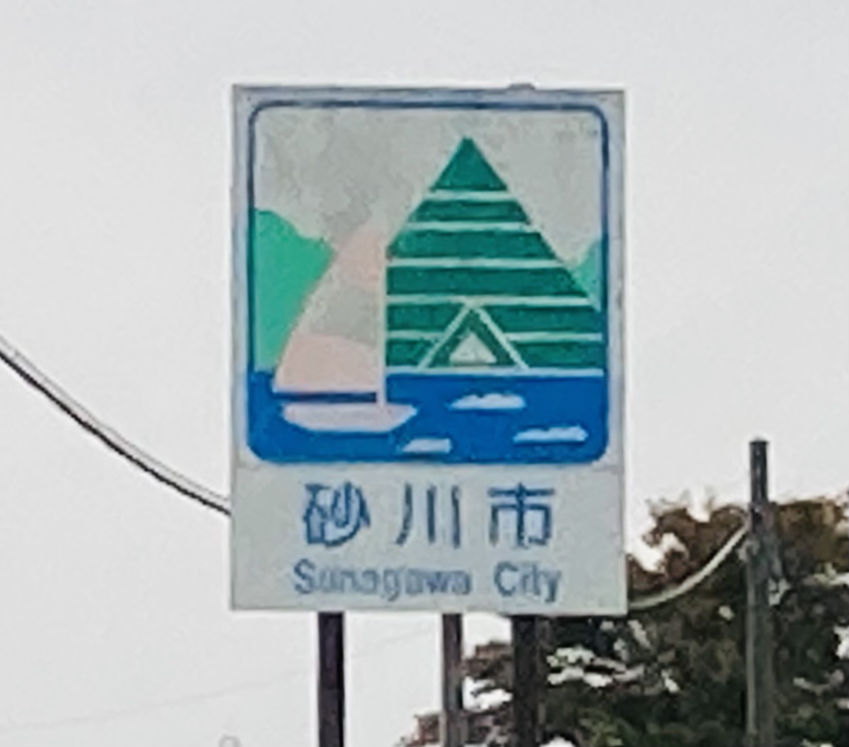 2012年5月1日、奈井江町を過ぎ砂川市に入った専務と岸ディレクター(以降、岸D)。国道12号でカントリーサインを発見(ココ)!専務は地面に座って両手で頭上に三角を作りピラミッド、背負っていたリュックをヨットに見立てお約束のカントリーサインポーズをクリア。※ピラミッドは観光スポット「北海道こどもの国」にあるそうです。
