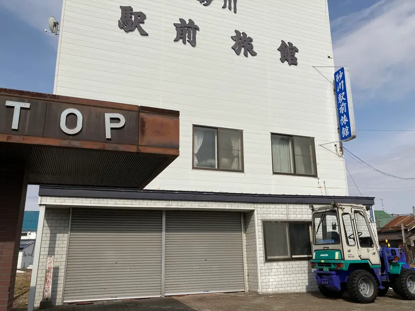 「宿探しはまず駅に向かえ」の鉄則に則り、まずは砂川駅を目指します。駅前で「砂川駅前旅館」の看板を見つけるものの入口のシャッターが降りているぞ、さて困った!そこにたまたま通りかかった酔っぱらい?の男性2人組から貴重な情報をいただき「田中旅館」を探します。