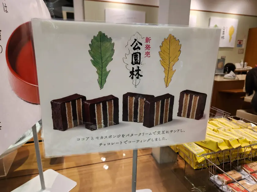 当時は、2種類の紅茶スポンジに紅茶のバタークリームを合わせ、紅茶チョコレートでコーティングしたお菓子でした。今回の「公園林」も、スポンジとクリームを重ねてチョコで包む構成が似ています。