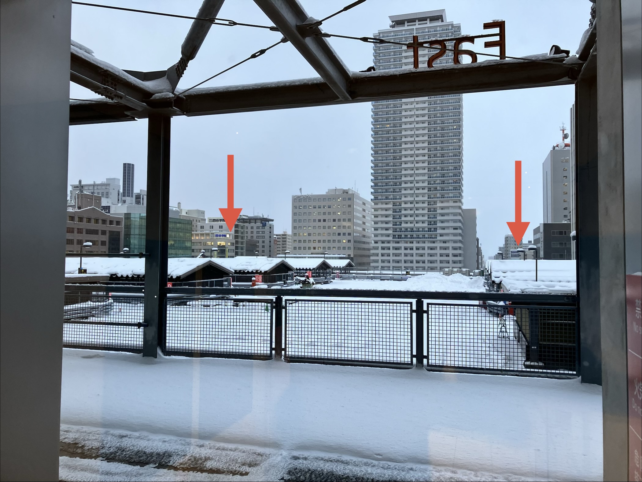 JRタワーから見下ろすと何と書いてあるか読めるアート「direction」がちょっとだけでも見れたらいいなと思い、積雪は承知の上ステラプレイスの4階の窓から探してみましたが、やっぱりダメだった!全く見えませーん。少しでも見えるようならJRタワーに登って見ようと決めてましたが今回はパス!