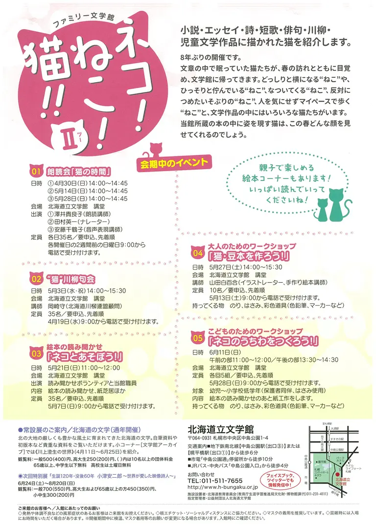 開催期間中には「猫」をテーマにした朗読会や川柳句会、絵本読み聞かせの他にワークショップも開催されます。
