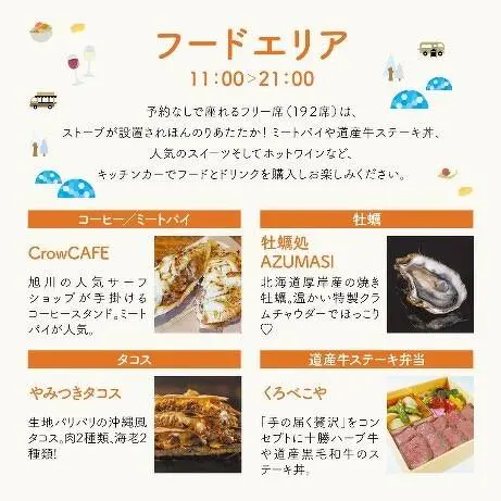 会場には、北海道の味覚を味わえる約10台のキッチンカーが集結。ミートパイや道産牛ステーキ丼、人気のスイーツ、そしてホットワインなどのアルコール類もご購入いただけます。予約なしで座れるフリー席(192席)にはストーブが設置され、ほんのり温まりながらお食事をお楽しみいただけます。また、エリア内ではWoltで使えるお得なクーポンコードをダウンロードできるほか、24(木)・25(金)限定で紅茶・甘酒や道内限定販売のポテトチップスのプレゼント企画※も実施します。