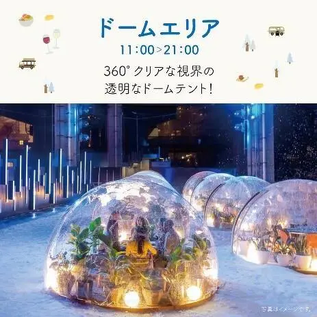 室内から景観を楽しめる360°クリアなドーム型テントを4基設置。雪が降る頃、ドームの辺りには真新しい雪化粧。昼はやわらかな日差しを感じながら、夜空の下では星や舞い落ちる雪を見上げながら、家族・友人・恋人と感動の思い出を共有できます※。ドームが放つ温かな光は、イルミネーションとしてもお楽しみいただけます。26(土)・27(日)は、ドームの中で朝ヨガ体験も実施。