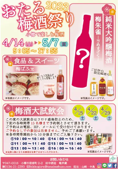 - ※梅酒大試飲会は、要予約(予約は電話、公式サイト、メールにて。 開催時間は、10:00~、11:00~、13:00~、14:00~、15:00~、16:00~ の6回開催で、各先着15名まで。