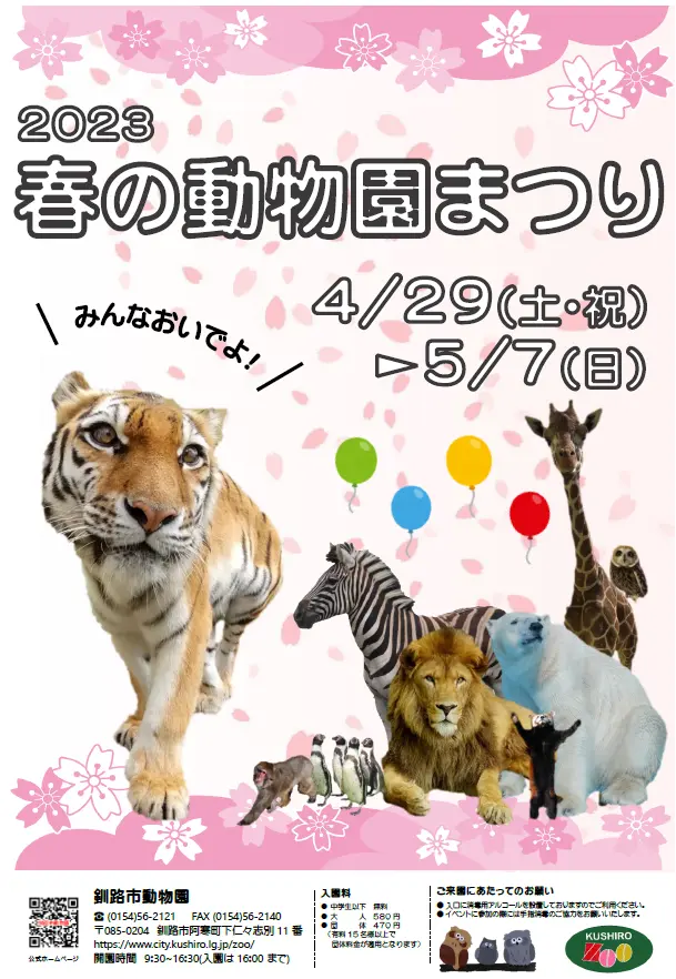 お祭・花火大会 釧路動物園 春の動物園まつり 開催日: 2023年4月29日(土) 〜 2023年5月7日(日) シェアする 開催日 2023年4月29日(土) 〜 2023年5月7日(日) 時間 9:30〜16:30 ※最終入園16:00 会場 釧路動物園 会場住所 釧路市阿寒町下仁々志別11番 料金 入園料:大人580円、中学生以下無料 お問い合わせ先 0154-56-2121 イベントカレンダーへ