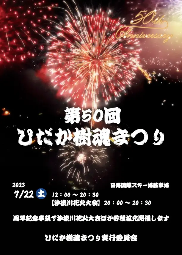 お祭・花火大会 第50回ひだか樹魂まつり 沙流川花火大会 開催日: 2023年7月22日(土) シェアする 出典:ひだか樹魂まつり実行委員会 【最新】北海道花火大会カレンダー2023(道央編) | MouLa HOKKAIDO 日本の夏の風物詩「花火」。2023年夏、北海道でも各地で花火大会が予定されています。 この記事では、北海道の花火大会のうち道央エリアの最新の開催情報をカレンダーでご紹介します。 最新... MouLa HOKKAIDO 開催日 2023年7月22日(土) 時間 12時〜20時半 沙流川花火大会:20時〜20時半 会場 日高国際スキー場駐車場 会場住所 北海道沙流郡日高町富岡444−1 主催 ひだか樹魂まつり実行委員会 お問い合わせ先 01457-6-2008 イベント情報の詳細はこちら イベントカレンダーへ