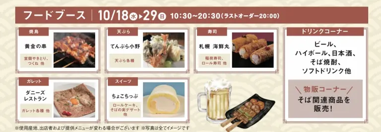 そばの他にも、焼鳥や天ぷら、寿司やガレットなどフードも盛りだくさん。また、会場ではそば打ちデモやそば打ち教室などのイベントも行われます。